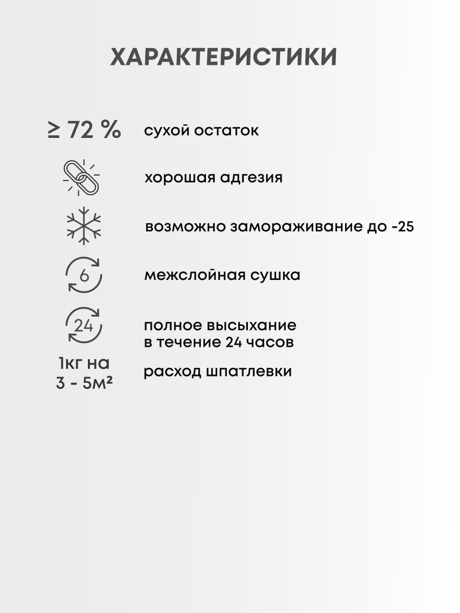 | Дополнительная информация | межслойная сушка – 6-8 часов; окончательный набор прочности покрытия – 14 суток; не рекомендуется разбавлять; способ нанесения - кельма или шпатель из нержавеющей стали, пластиковая кельма |