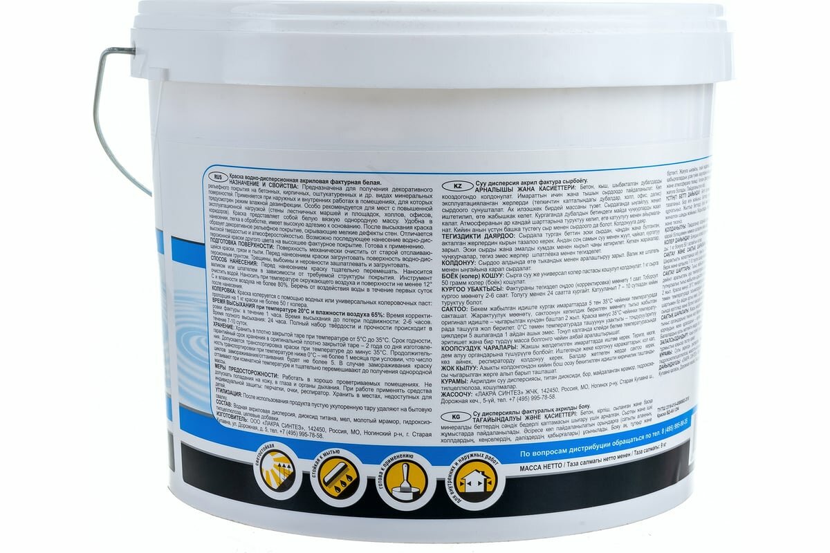 | Дополнительная информация | состав: водная акриловая дисперсия, диоксид титана, мел, молотый мрамор, гидроксиэтилцеллюлоза, целевые добавки; время корректировки фактуры: в течение 1 часа; время высыхания до потери подвижности: 2-6 часов; полный набор твёрдости и прочности происходит в течение 7-10 суток; при колеровке: пропорция на 1 кг краски не более 50 г колера; допускается транспортировка краски при температуре до минус 35°С |