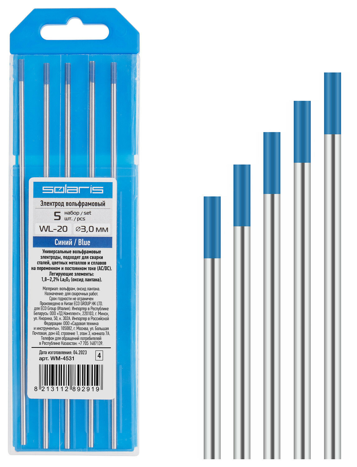 Купить Электрод вольфрамовый синий WL-20, Ф 3,0 мм (набор 5 шт) SOLARIS (WM-4531)