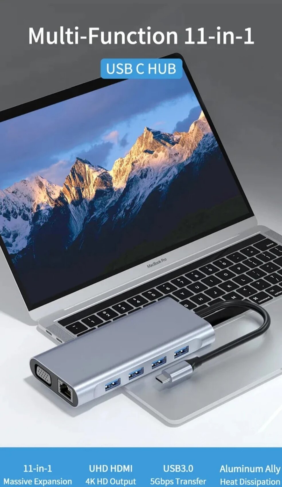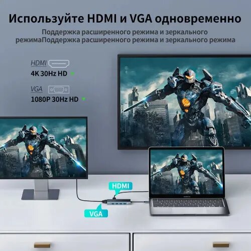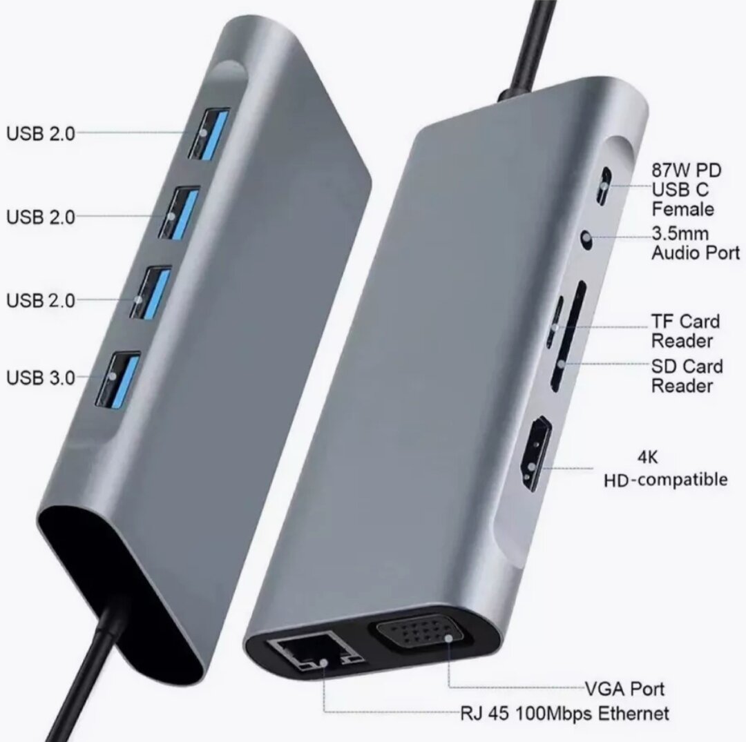 | Дополнительная информация | Тип интерфейса: USB Type-C Порты: 11 Стандарт: USB 3,0 Функция: HDMI-совместимый/кард-ридер/RJ45. Цвет: серый Материал: алюминиевый сплав Выходной интерфейс: USB2.0 * 3/USB3.0 * 1/RJ45 100mbps * 1/VGA * 1/4k HDMI-совместимый * 1/87W PD * 1/3.5 мм * 1/порт TF/порт SD |