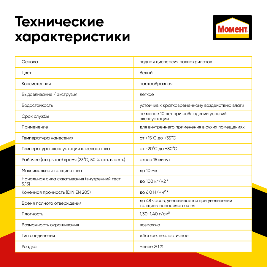 | Дополнительная информация | 200-400 г/кв.м для декоративных и изоляционных панелей, 20-40 г/м для профилей, панелей из дерева; при нанесении сплошным валиком диаметром 6 мм: 10 п. метров - 400 г |