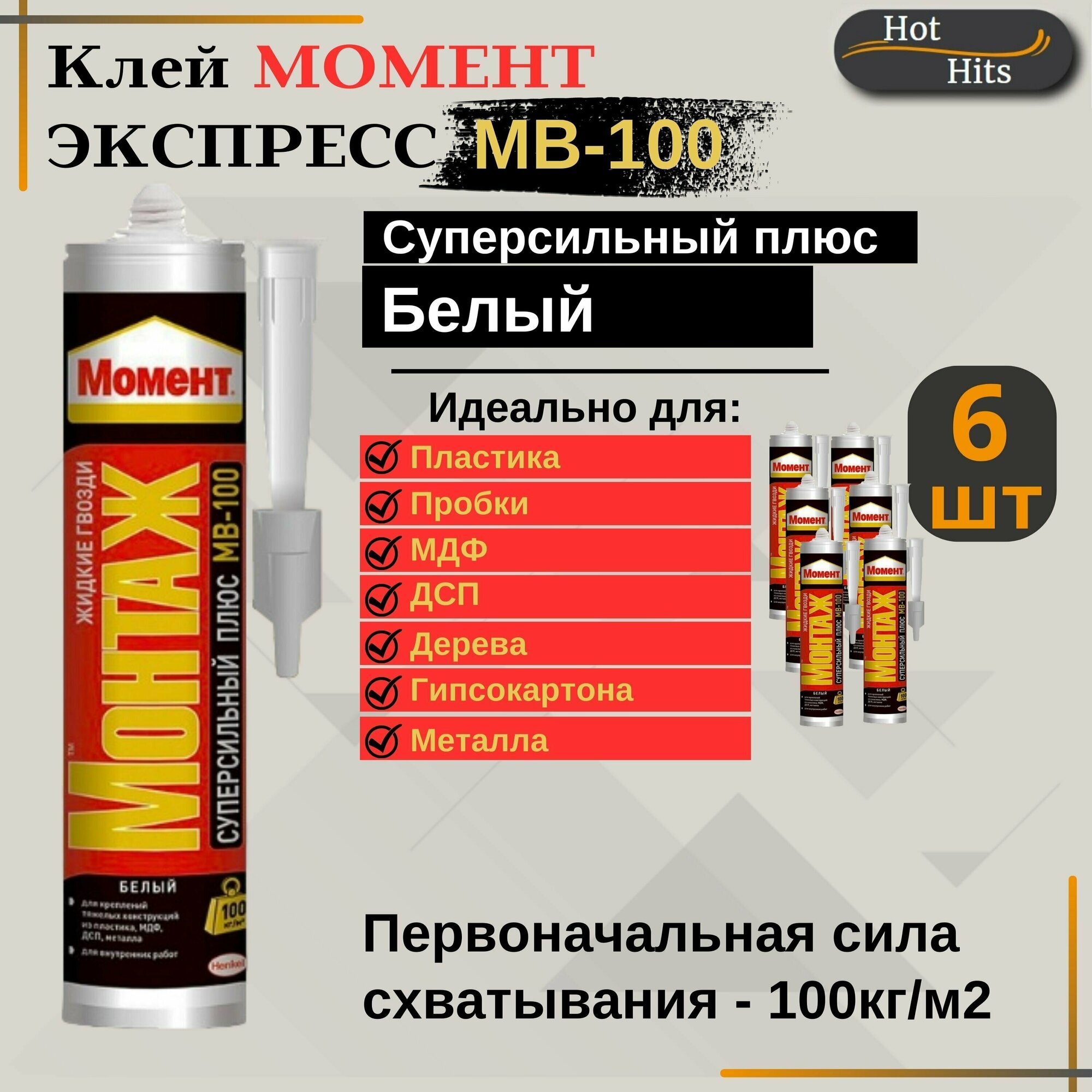Монтажный клей Момент Монтаж Суперсильный Плюс МВ-100, 6 шт.