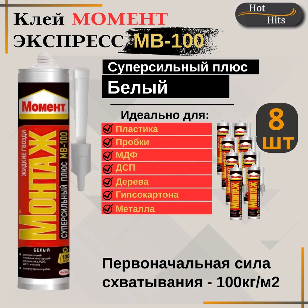 Клей момент,Монтажный клей Момент Монтаж МВ-100 Суперсильный плюс 400г белый, жидкие гвозди 6шт