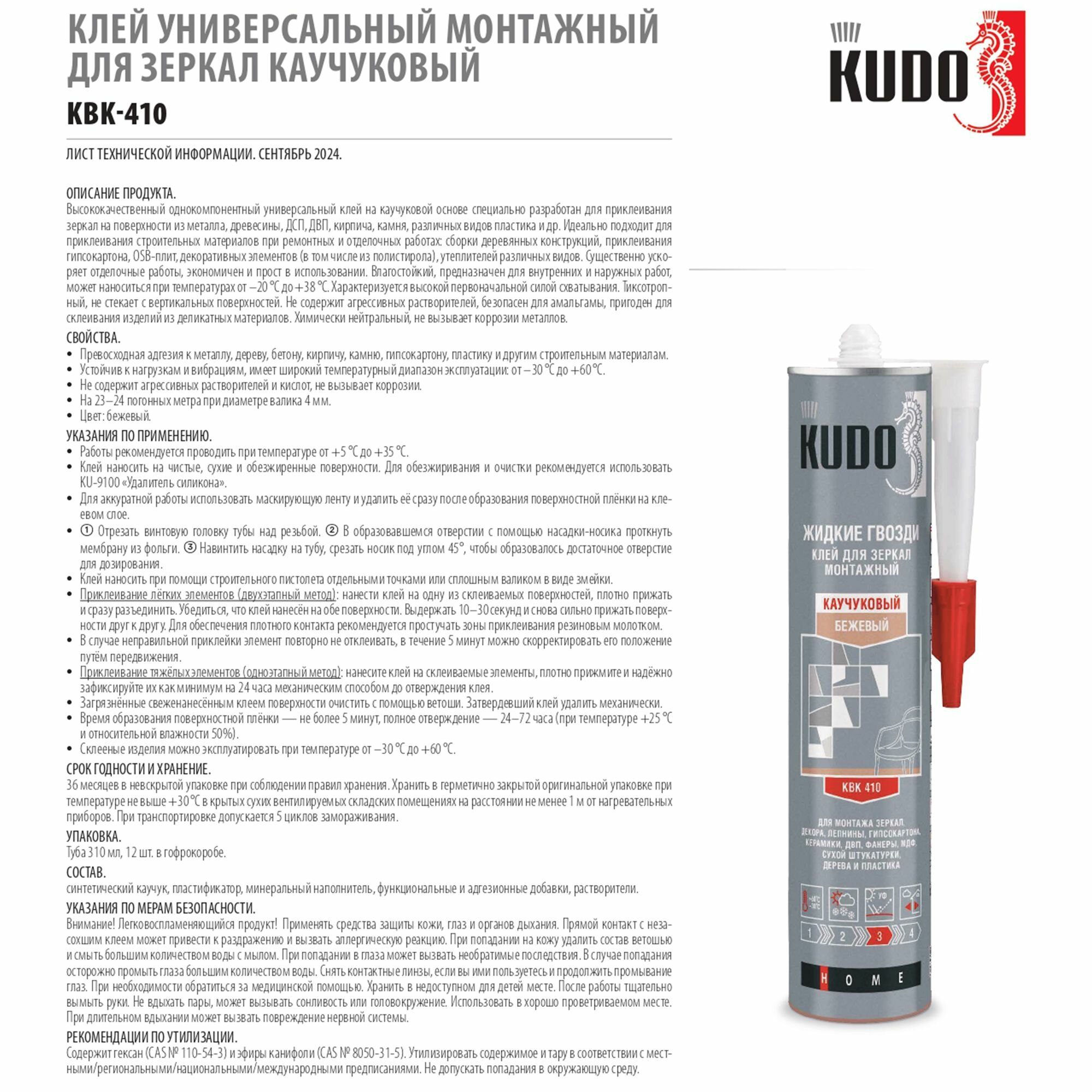 Клей каучуковый монтажный "Жидкие гвозди" KUDO для зеркал, KBK-410 интересное: