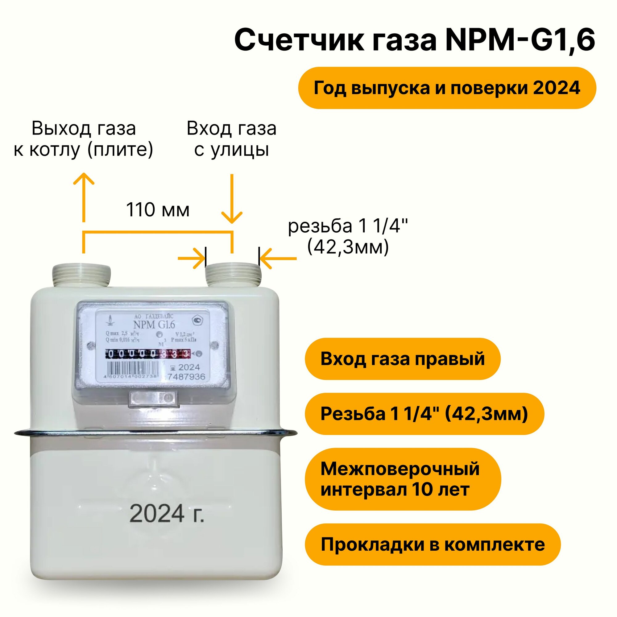 Счетчик газа NPM-G1,6 (вход газа <--правый, резьба 1 1/4", прокладки В комплекте) 2024 года выпуска и поверки интересное:
