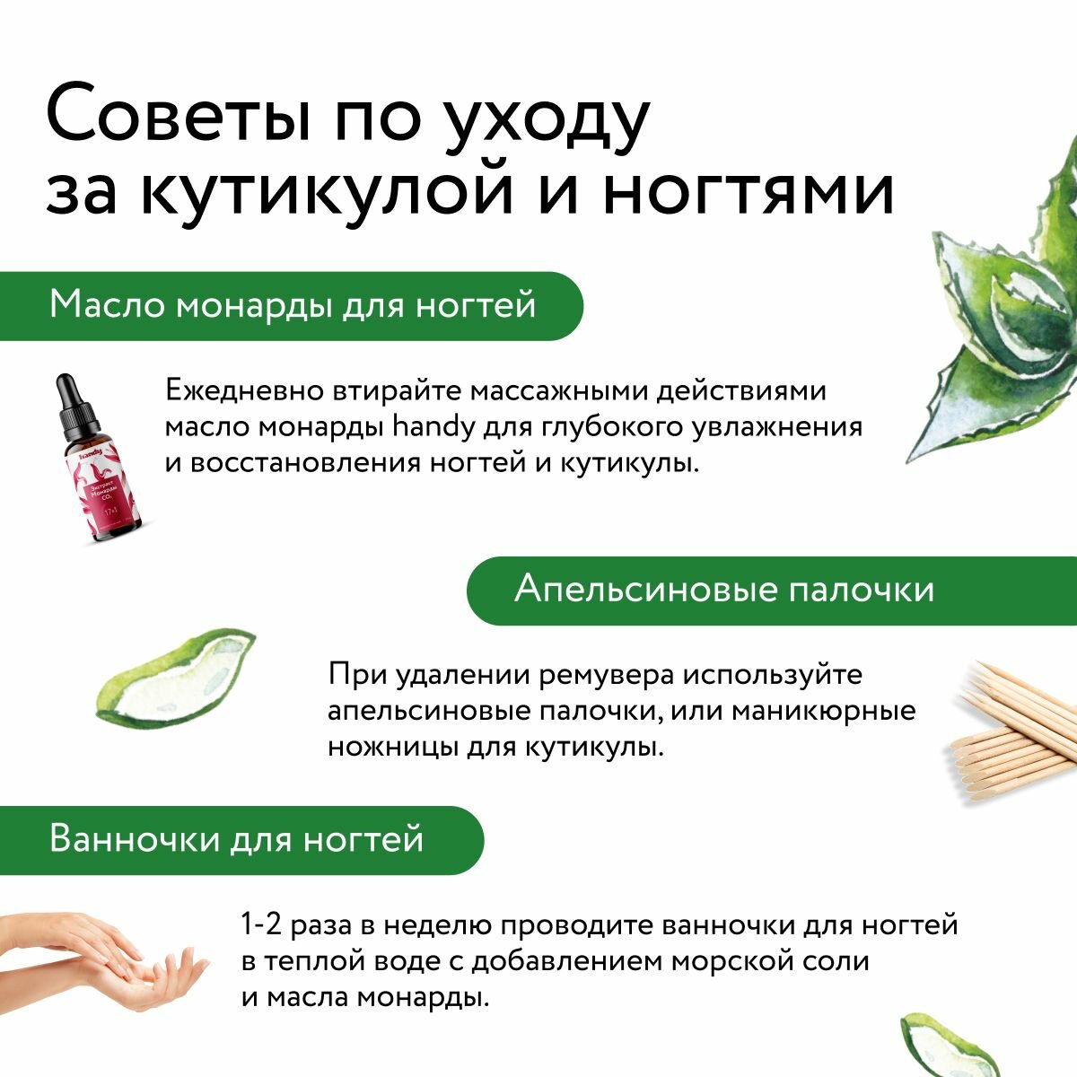 | Способ применения | Нанесите ремувер на область кутикулы. Через 30-60 секунд отодвиньте размягченную кутикулу к краю и удалите ее при помощи апельсиновой палочки. |