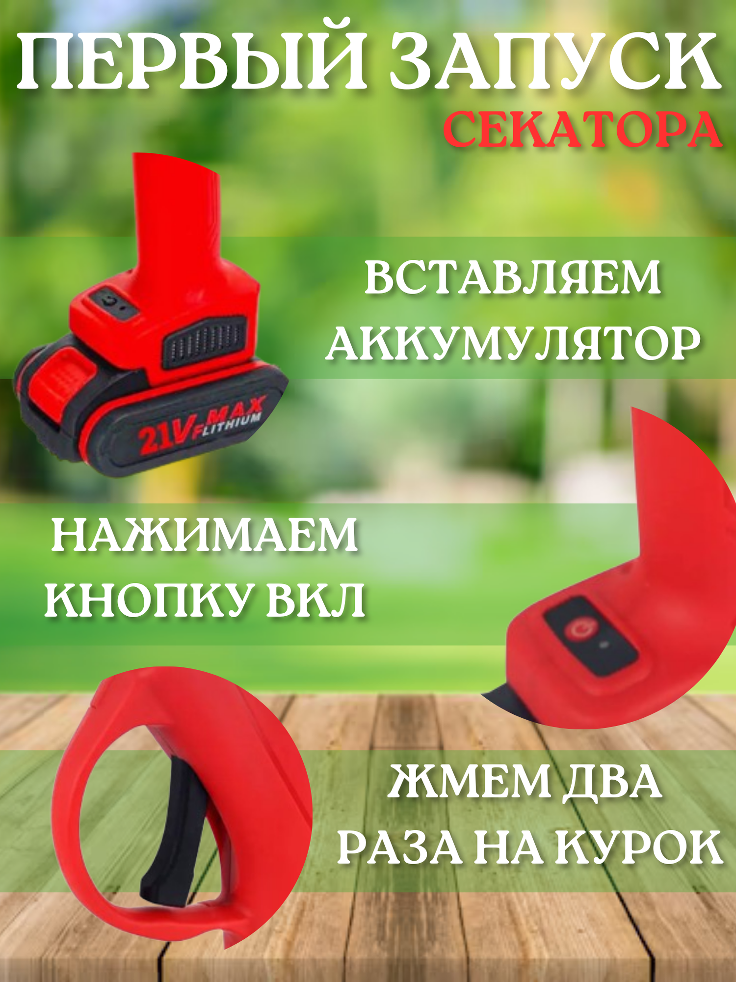 | Дополнительная информация | Для того чтобы активировать секатор, нужно вставить аккумулятор, нажать на кнопку, и два раза нажать на курок |