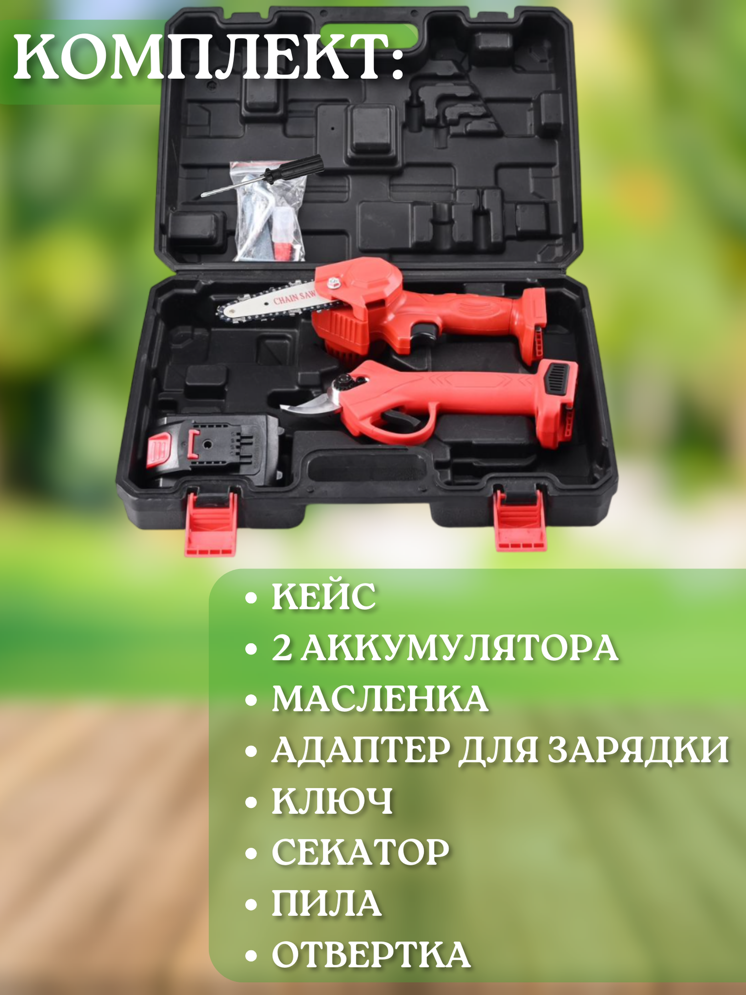 Секатор пила садовый аккумуляторный для дачи огорода дома/ набор инструментов для дачи