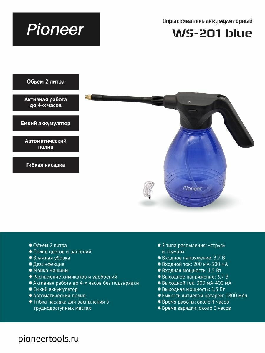 Многофункциональный опрыскиватель аккумуляторный садовый Pioneer WS-201 blue / 2 литра / Полив растений / Влажная уборка / Мойка окон интересное:
