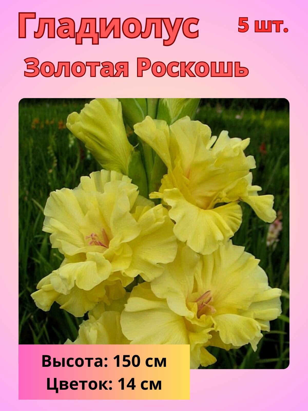 Ниже Вы можете прочитать отзывы на Гладиолус крупноцветковый Золотая Роскошь, луковицы Гладиолуса, ознакомится с подробными характеристиками, посмотреть интересные обзоры и фотографии на Гладиолус крупноцветковый Золотая Роскошь, луковицы Гладиолуса.