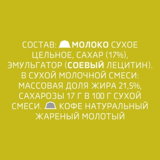 | Состав | смесь молочная сухая с сахаром (сухое цельное молоко (82,4%), сахар), кофе натуральный жареный молотый, массовая доля жира 22,4%, премиальные арабика и робуста |