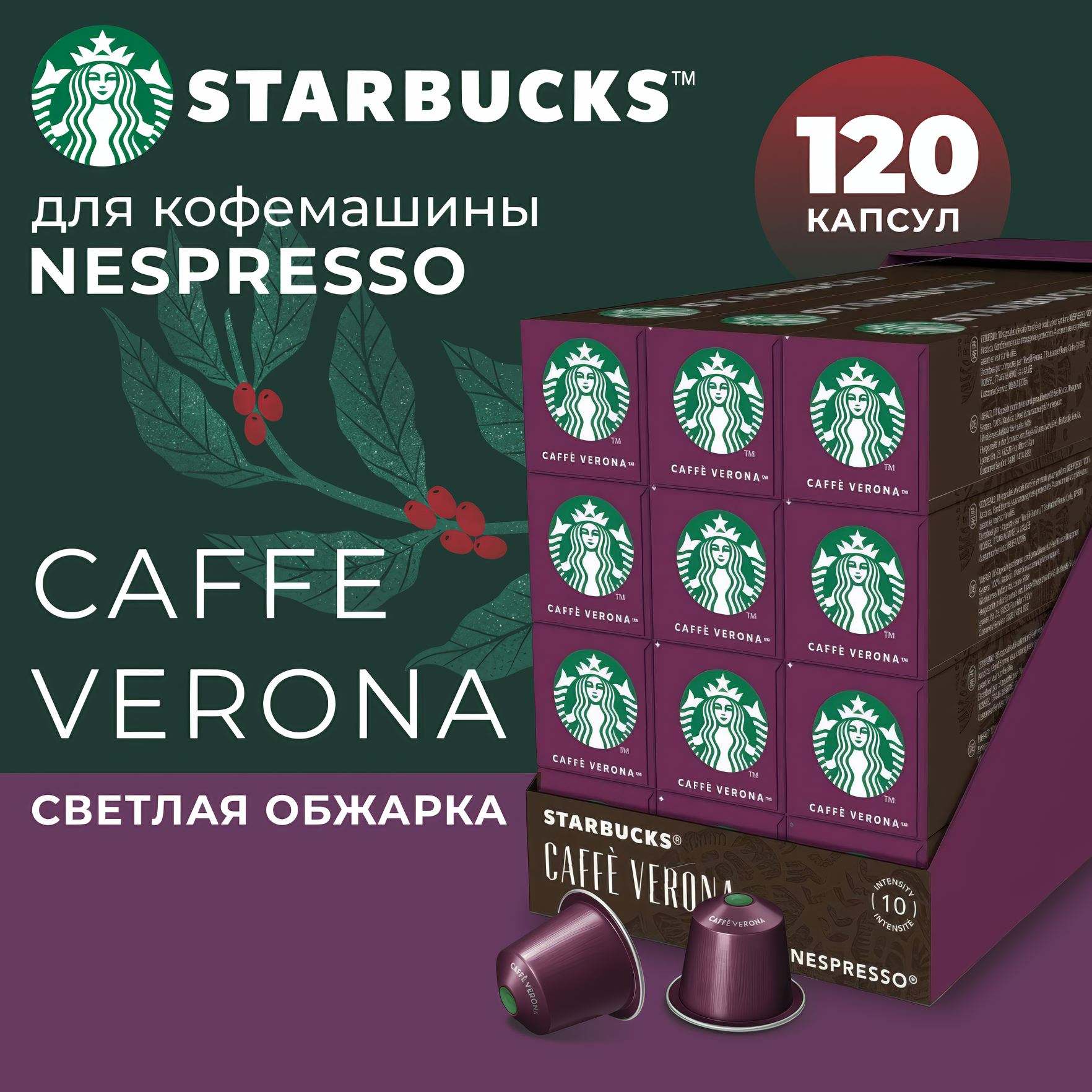 Купить Кофе в капсулах Starbucks Nespresso Capsules Caffe Verona, Старбакс в капсулах для кофемашины неспрессо, эспрессо, 12 упаковок по 10 штук