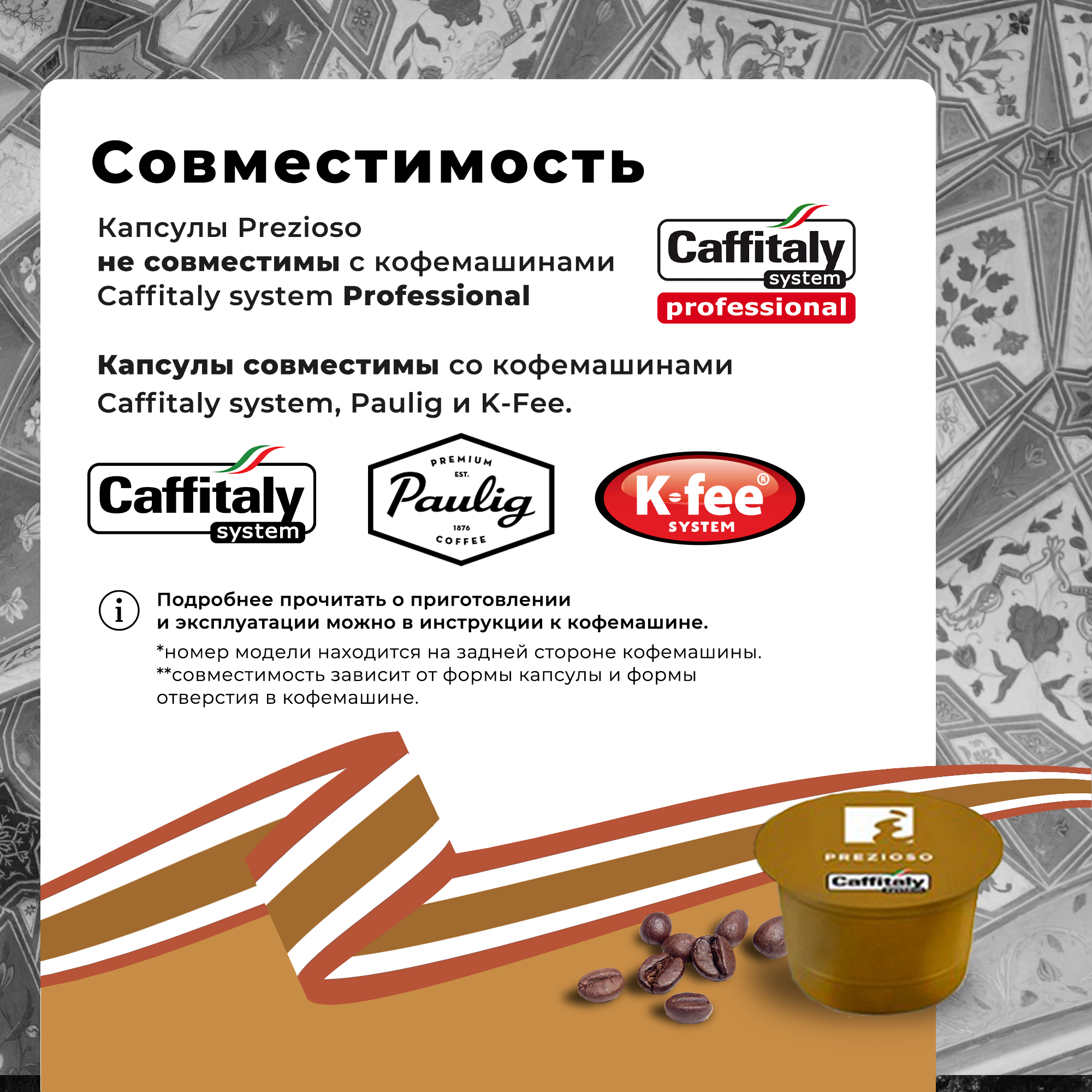 | Состав набора | 100 капсул кофе Prezioso |