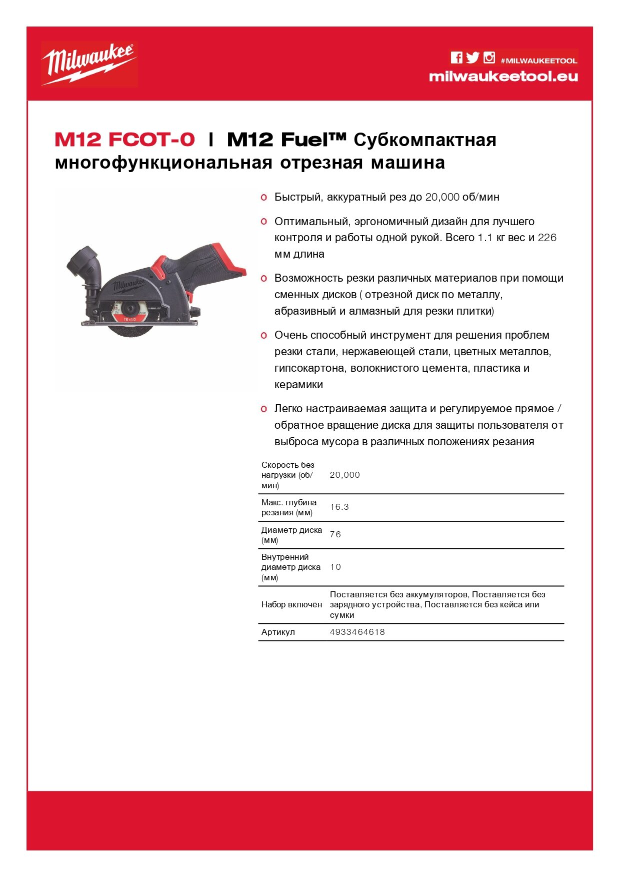 Отрезная машина Milwaukee M12 FCOT-0 FUEL аккумуляторная (без АКБ и ЗУ) 4933464618 интересное: