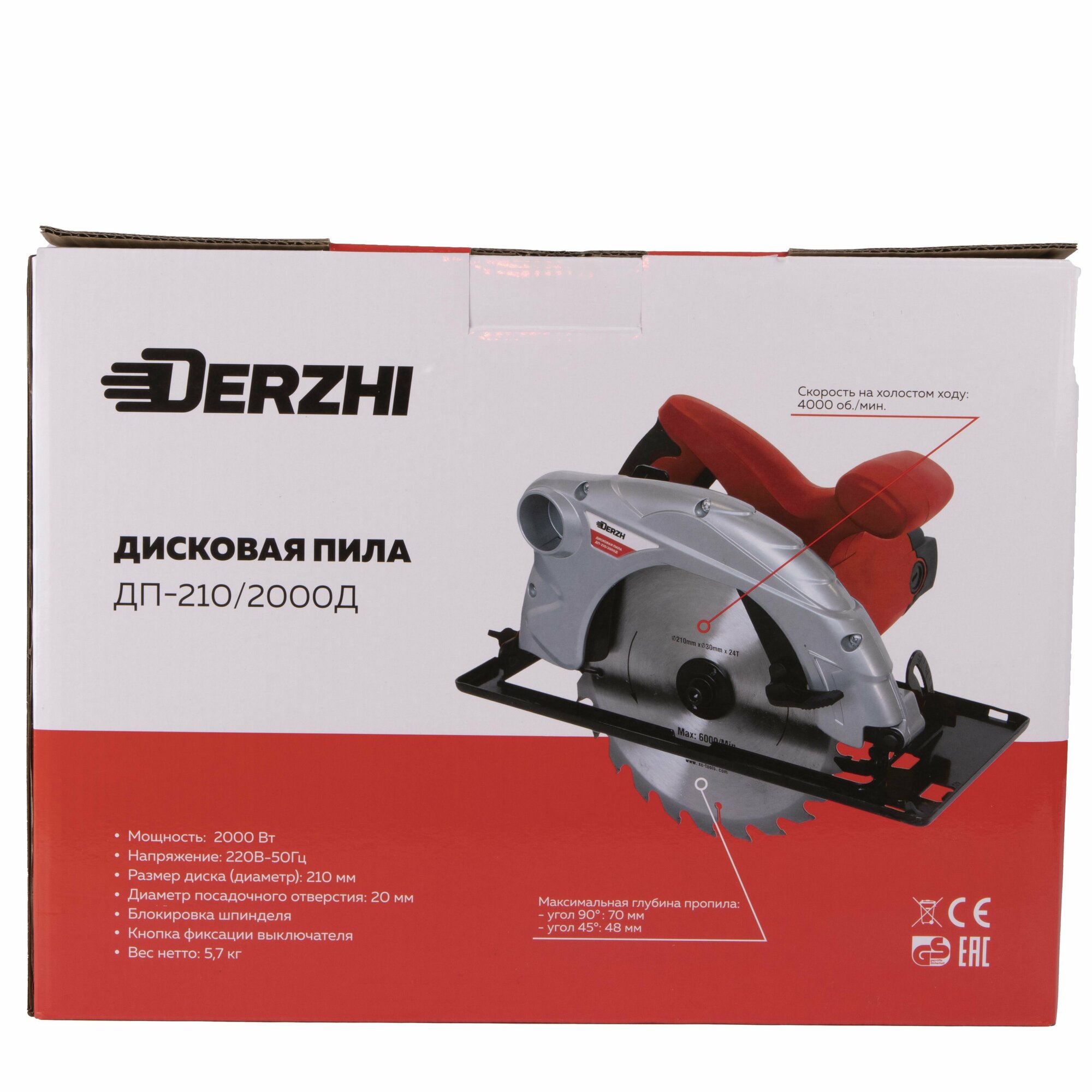 Купить Дисковая пила (циркулярная) DERZHI 2000Вт (210х20мм, 70 мм пропил, 4000 оборотов/мин)