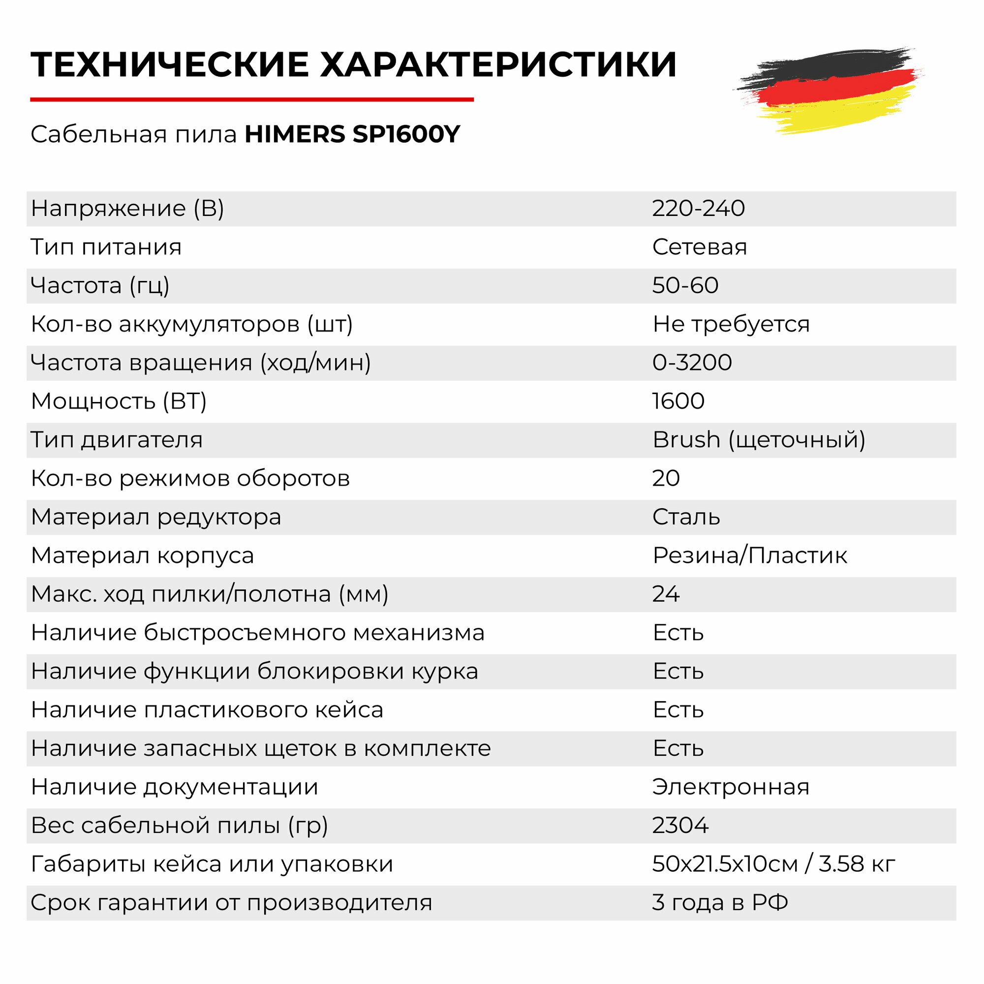 Сабельная пила HIMERS SP1600Y сетевая, 1600 Вт, 0-3200 ход/мин, 24 мм ход, Кейс, регулировка скорости, бесключевая замена пилок интересное:
