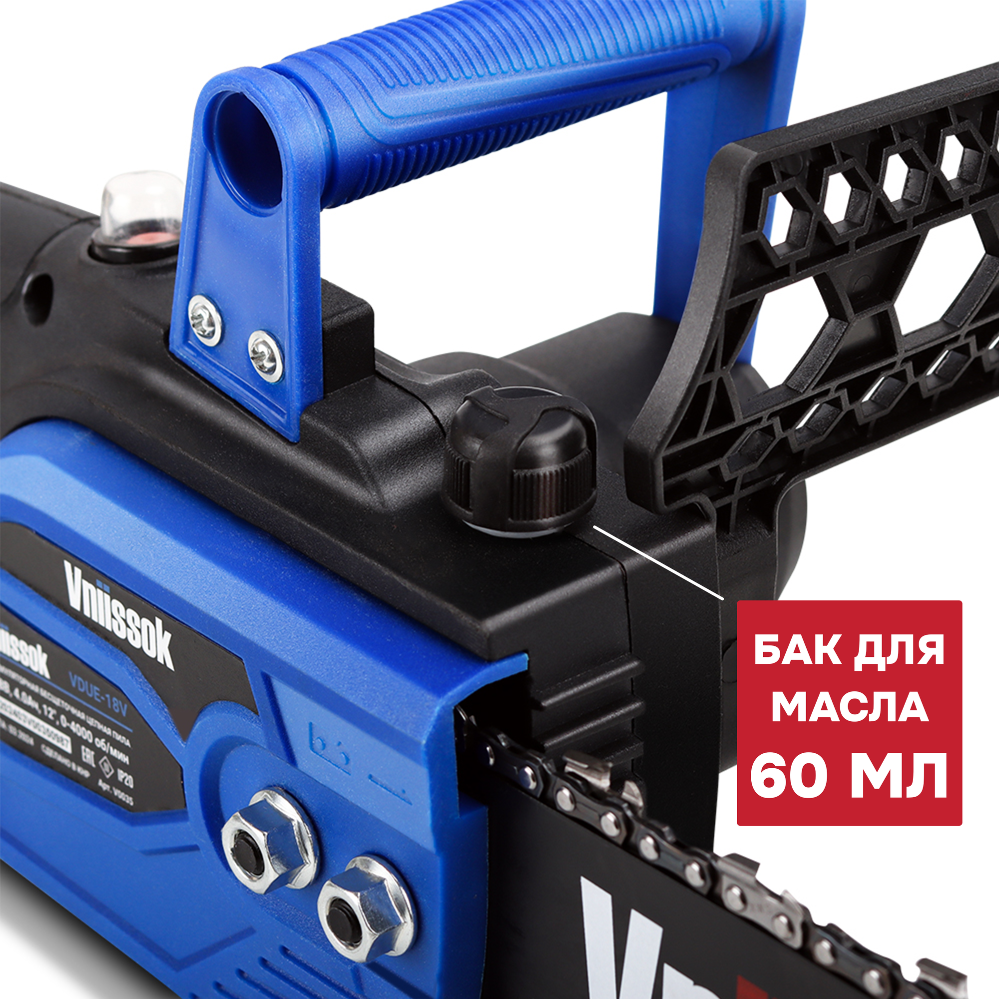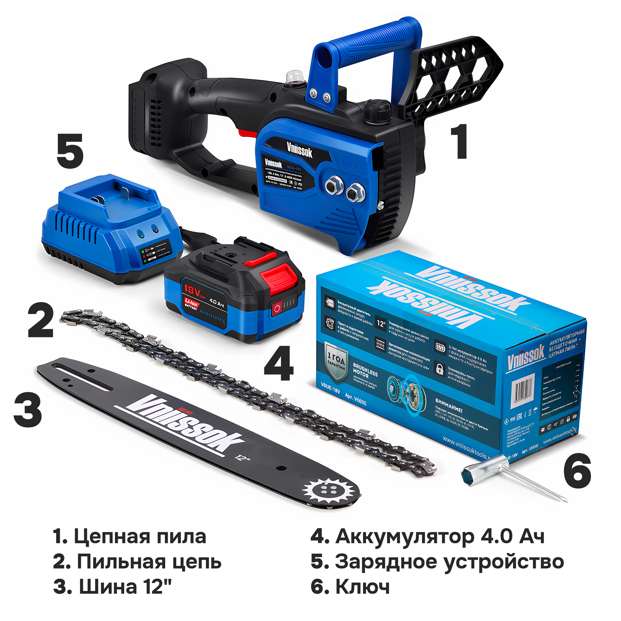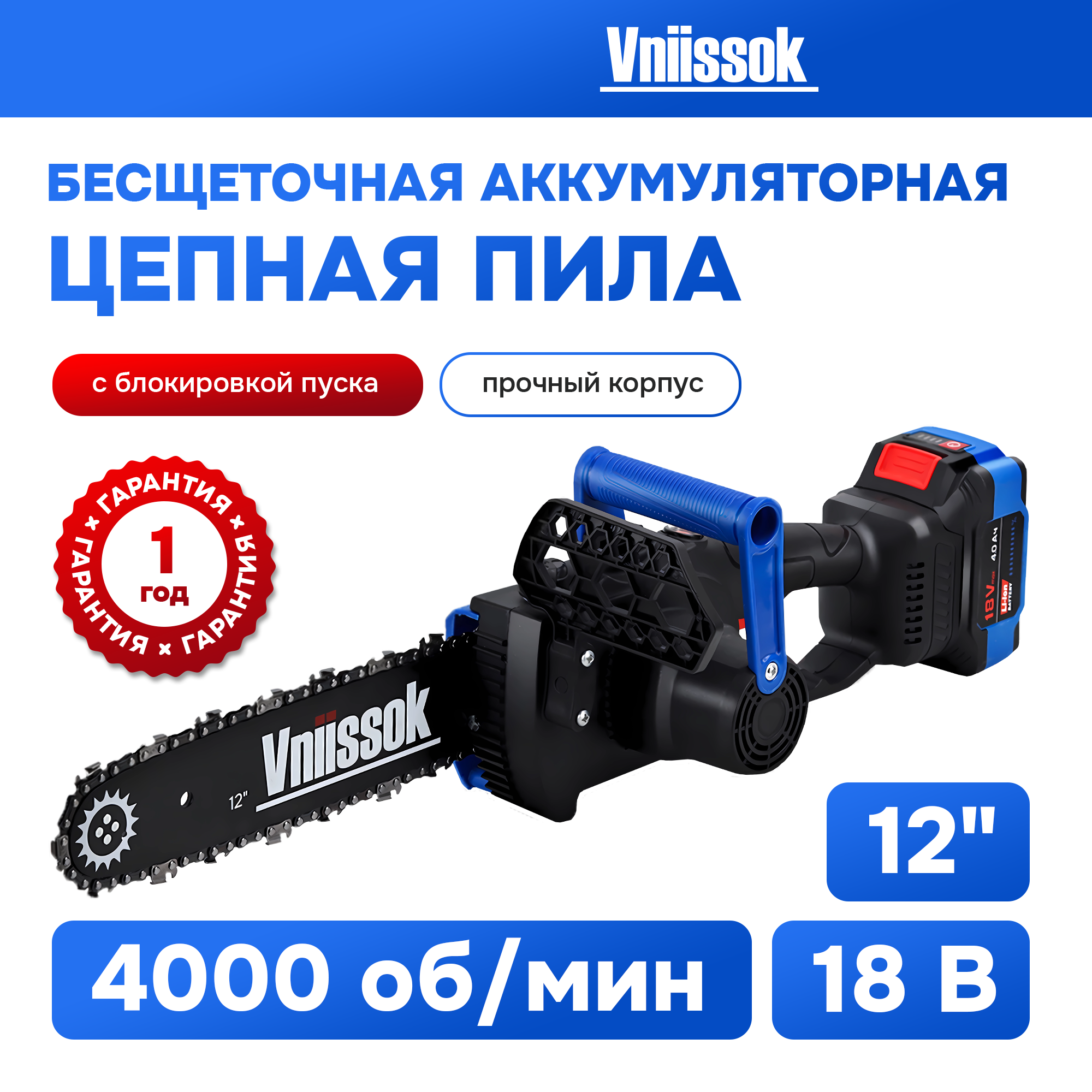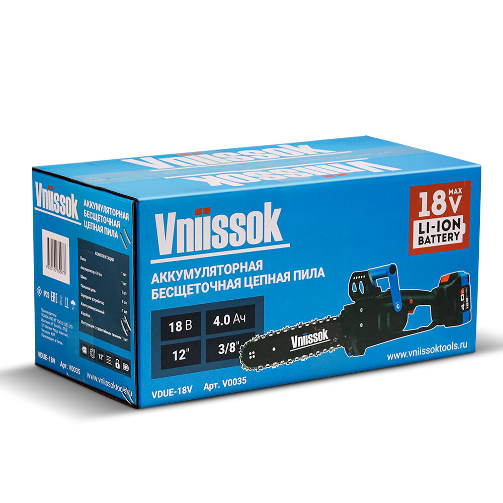 Купить Аккумуляторная бесщеточная цепная пила VNIISSOK VDUE-18V (18В,Li-ion-1шт,4.0Ач,12",З/У,в коробке)