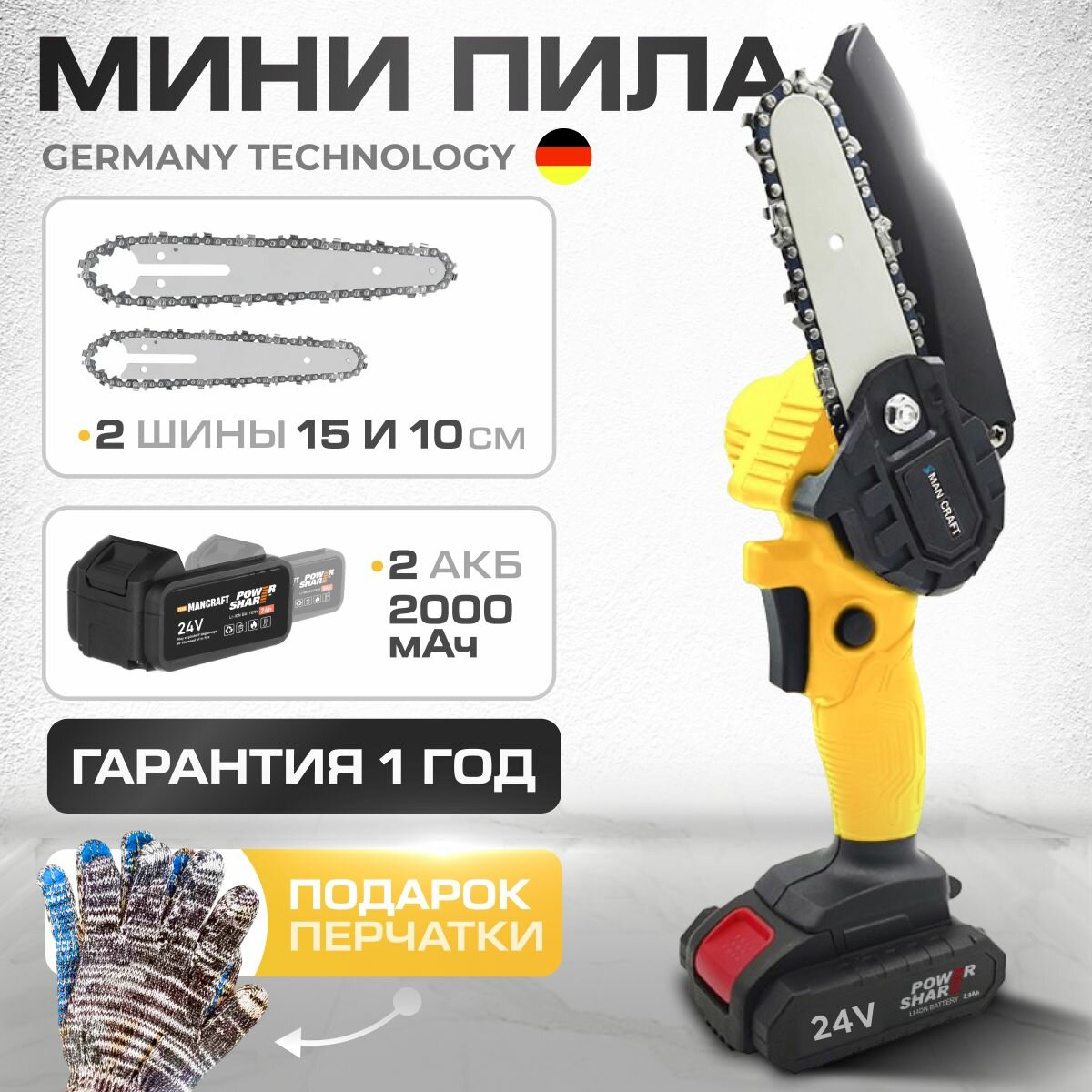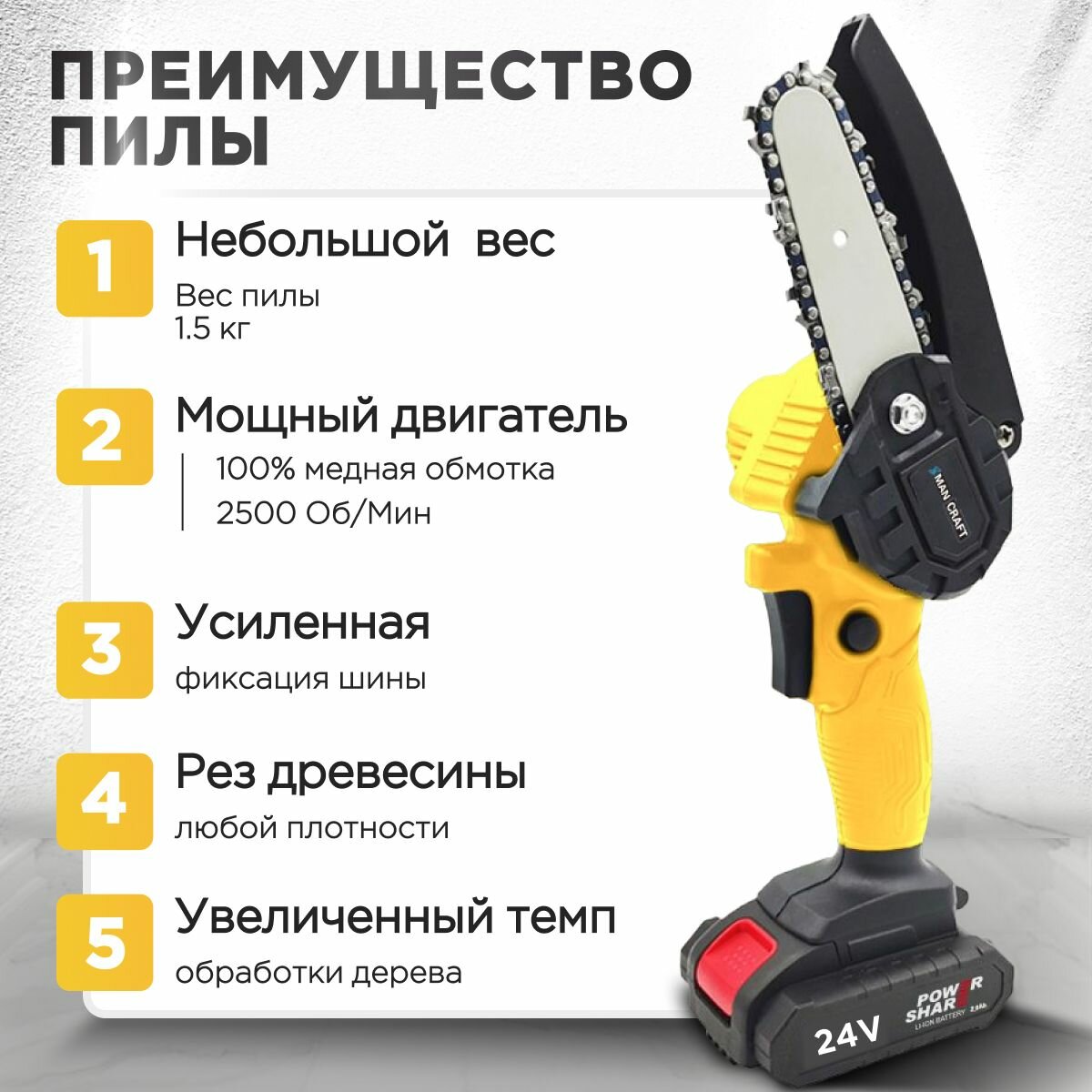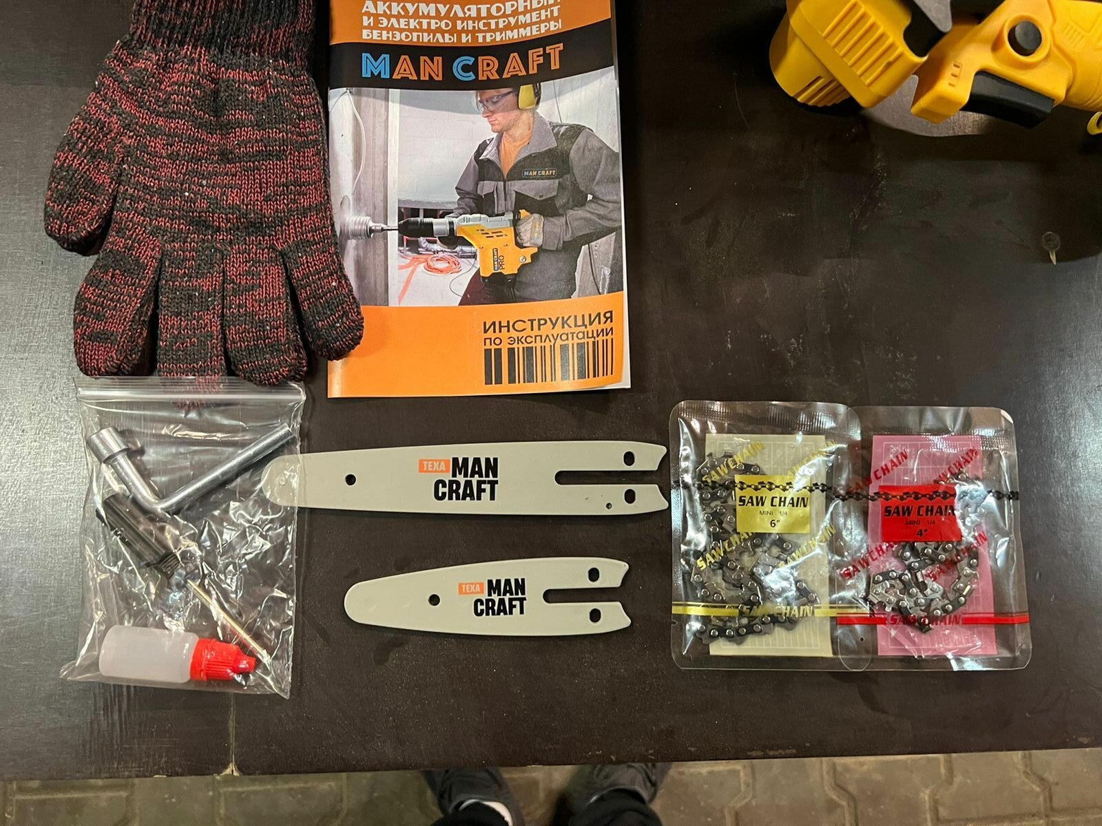Электропила Мини пила аккумуляторная цепная садовая MANCRAFT 15 см + 10 см, 2 цепи, 2 акк интересное: