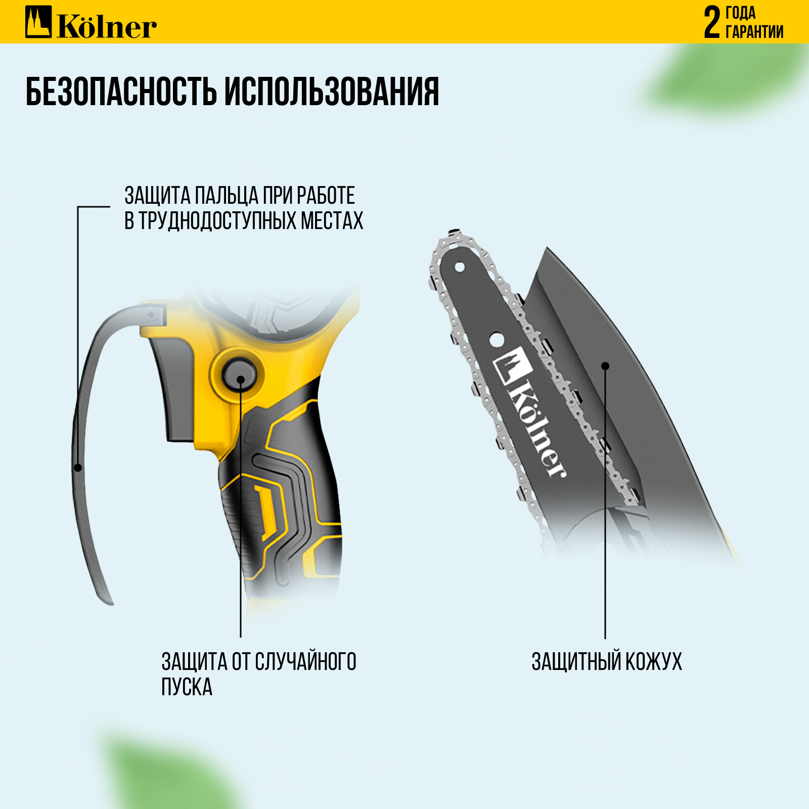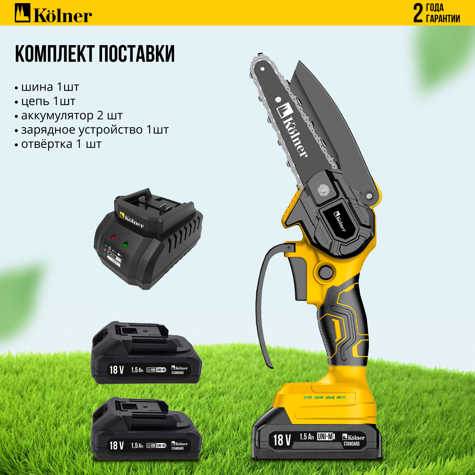 Цепная пила Kolner KCS 18-10-2K UNI Standard, Li-ion аккумулятор, длина шины 10 см, желтая