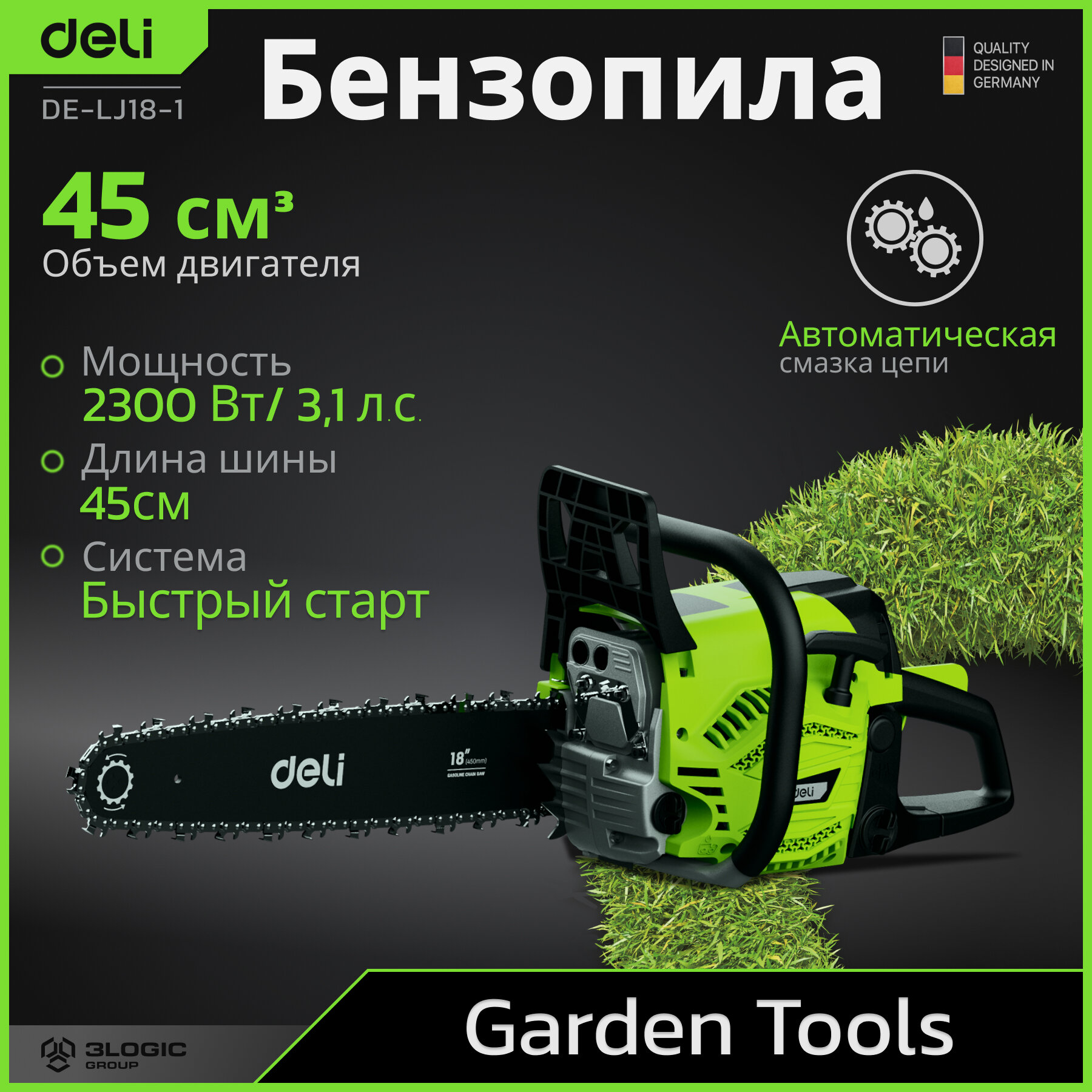 Бензопила цепная Deli DE-LJ18-1 (2300Вт/ 3,1 л.с, шина 45см, двигатель 45 см3, 12000 об/мин)