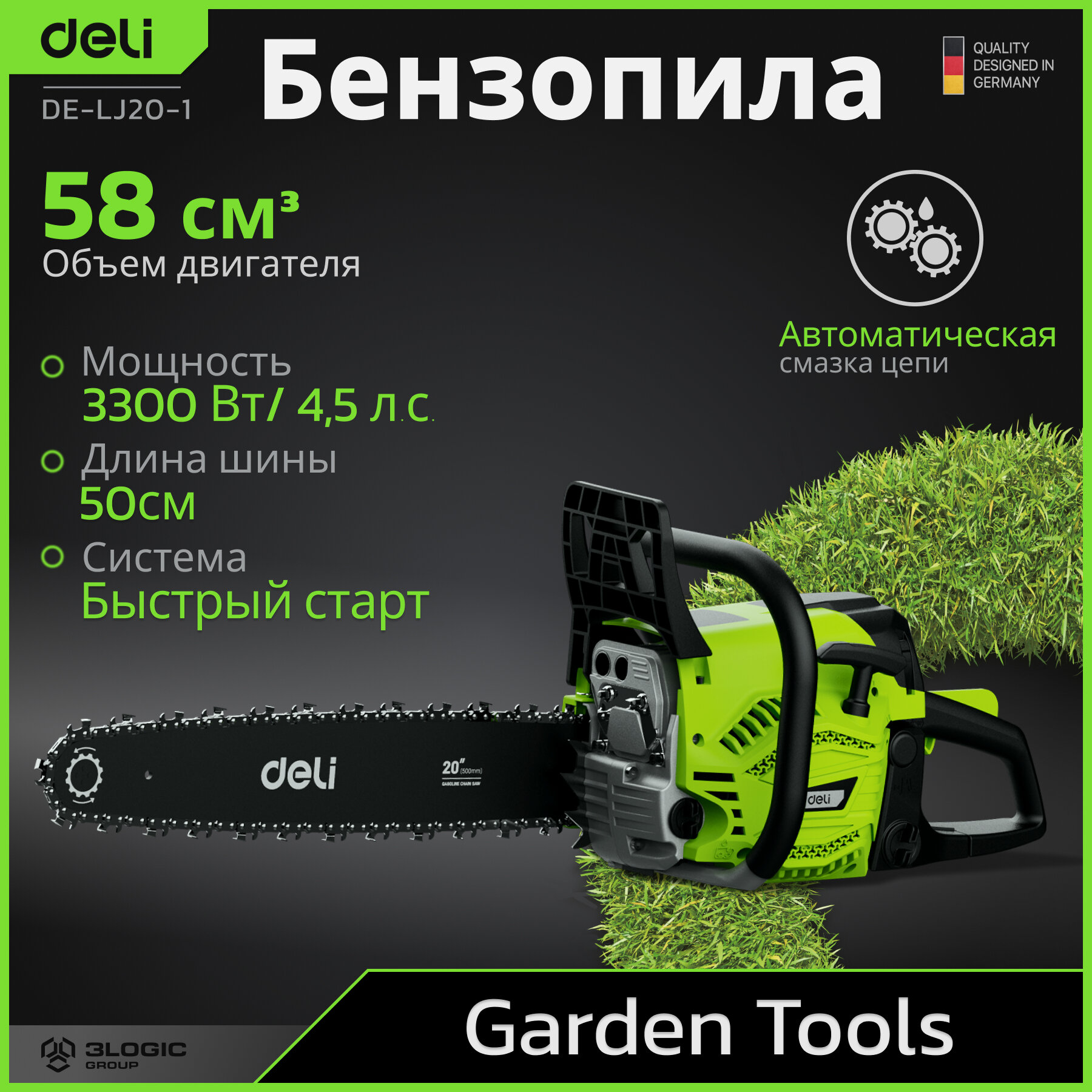 Бензопила цепная Deli DE-LJ20-1 (3300Вт/ 4,5 л.с, шина 50см, двигатель 58 см3, 12000 об/мин)