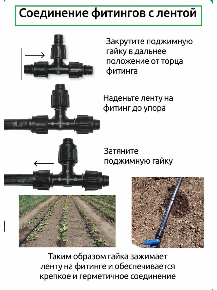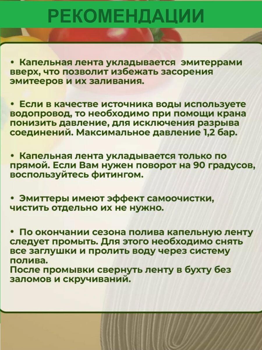 | Комплектация | капельная лента 120 м., магистральная лента 10 м., стартовый кран с резиновым уплотнителем - 1 шт., угол 90 гр., с поджимом - 2 шт., тройник с поджимом - 11 шт., заглушка с поджимом - 12 шт., ремонтный соединитель - 3 шт. |