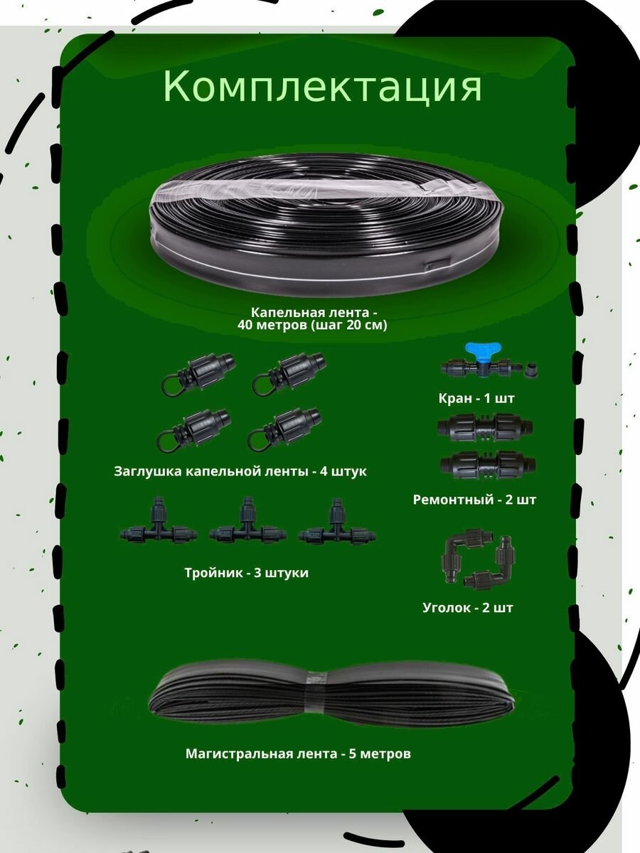 | Комплектация | капельная лента 120 м., магистральная лента 10 м., стартовый кран с резиновым уплотнителем - 1 шт., угол 90 гр., с поджимом - 2 шт., тройник с поджимом - 11 шт., заглушка с поджимом - 12 шт., ремонтный соединитель - 3 шт. |