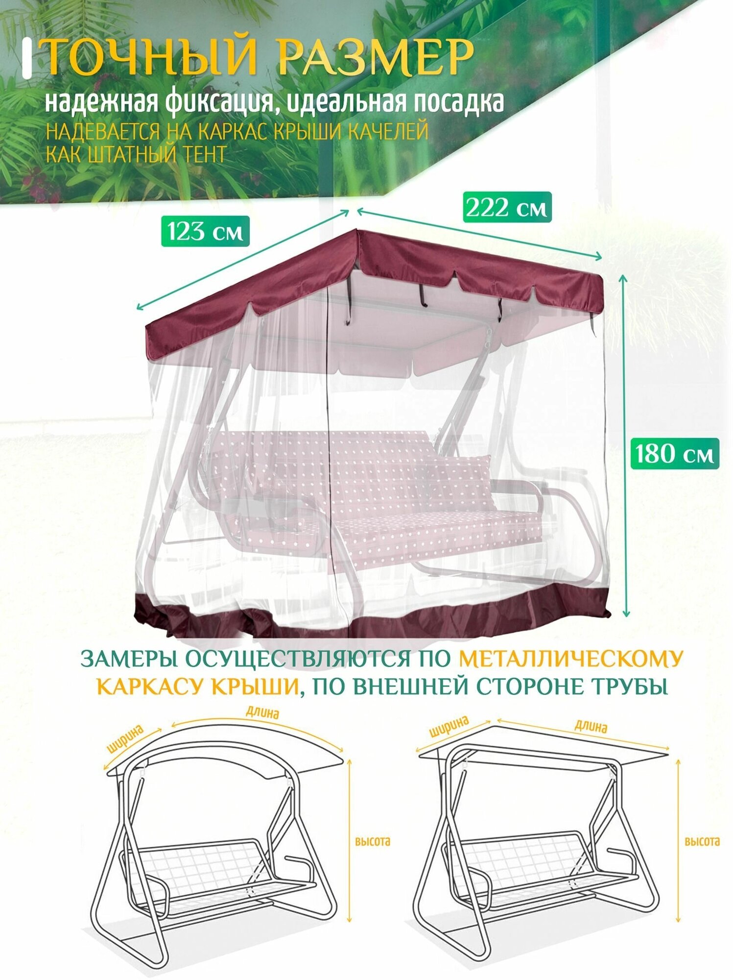 | Дополнительная информация | Тент с москитной сеткой для садовых качелей из уплотненной ткани Оксфорд 240D и прочной сеткой |