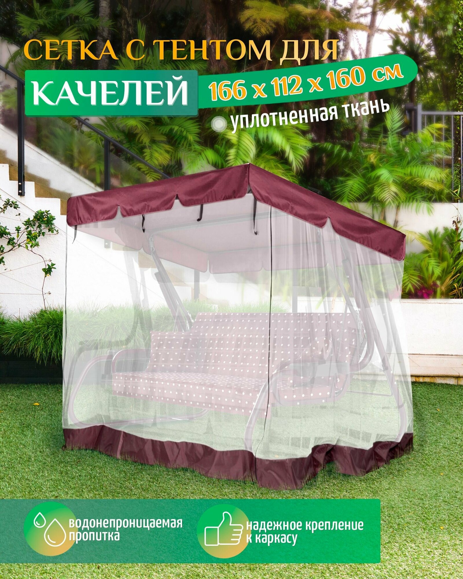 | Дополнительная информация | Тент с москитной сеткой для садовых качелей из уплотненной ткани Оксфорд 240D и прочной сеткой |