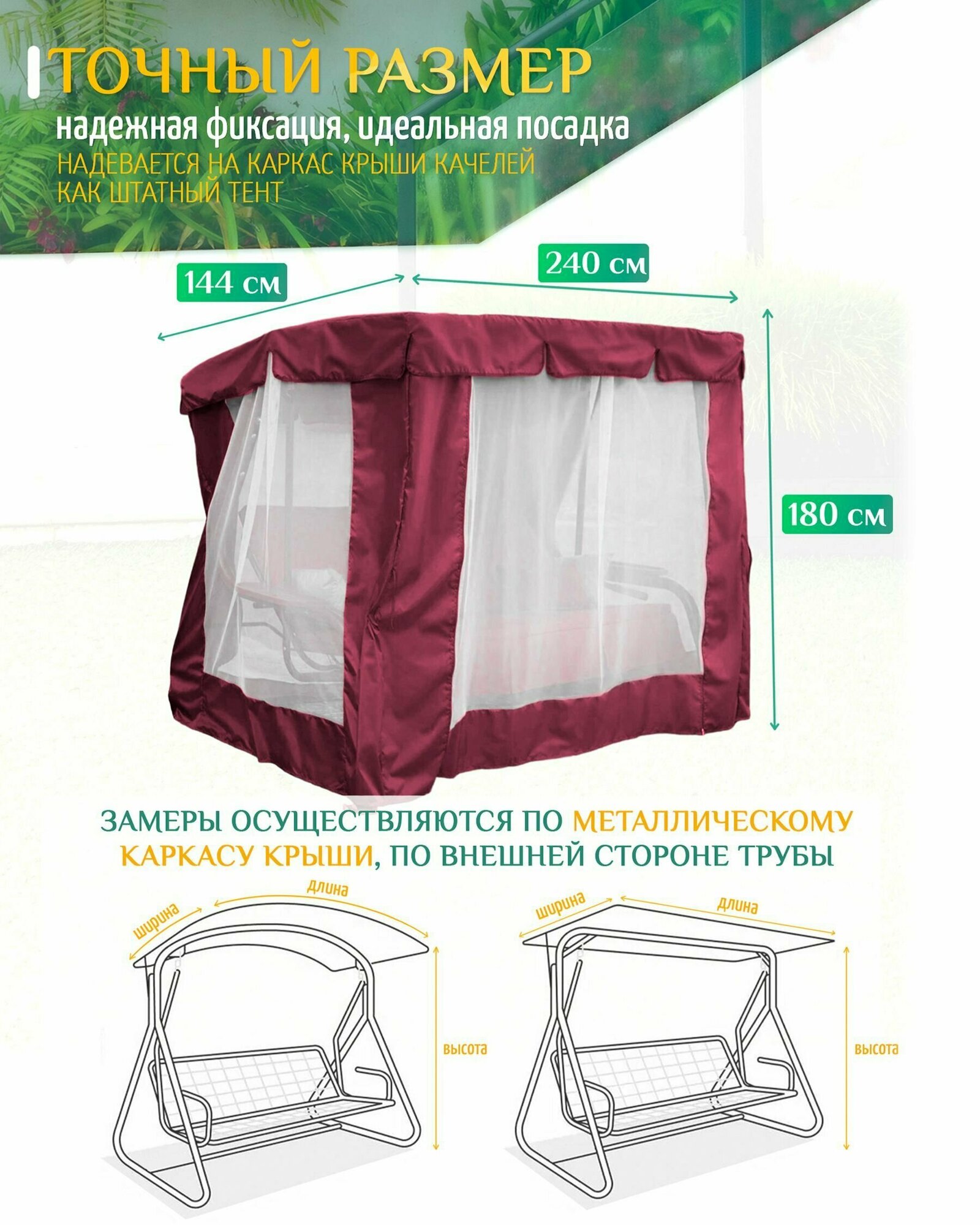 | Дополнительная информация | Тент - шатер с москитной сеткой для садовых качелей из уплотненной ткани Оксфорд 240D и прочной сеткой |