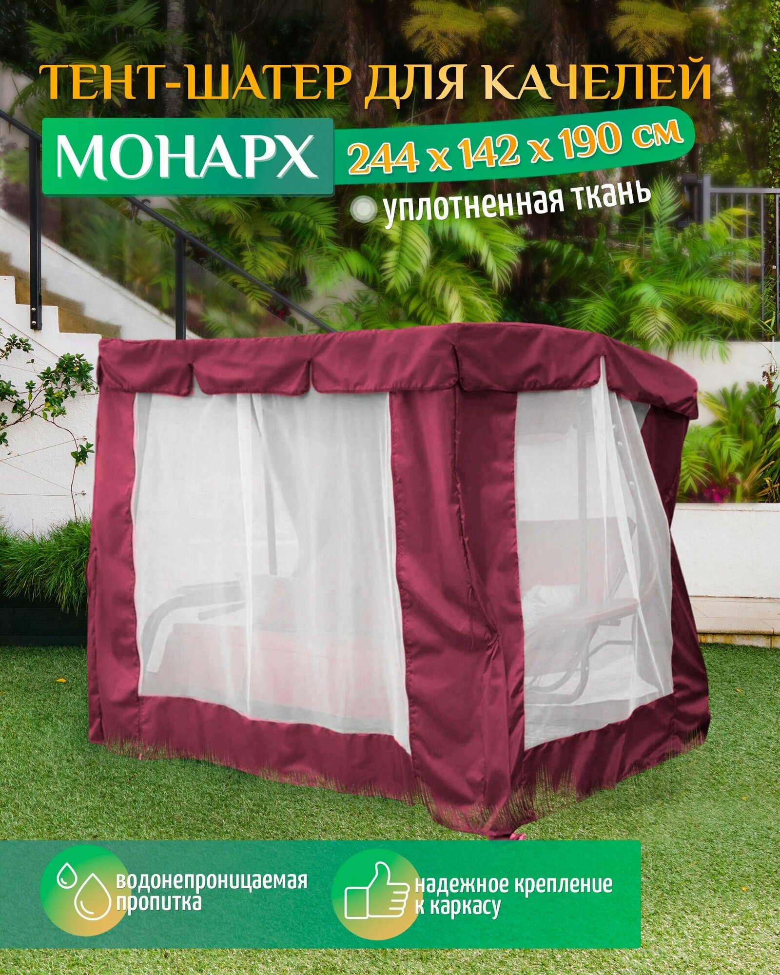 | Дополнительная информация | Тент - шатер с москитной сеткой для садовых качелей из уплотненной ткани Оксфорд 240D и прочной сеткой |