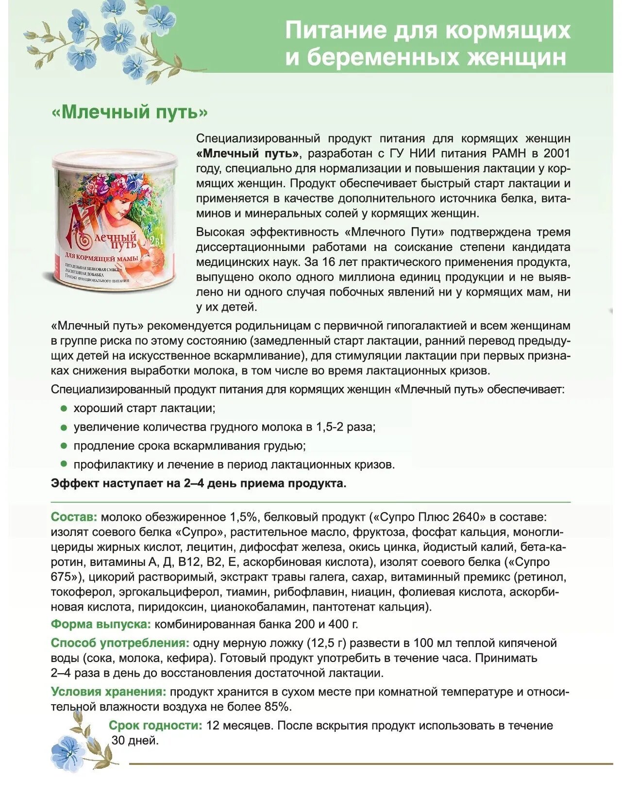 | Дополнительная информация | Рекомендуемая суточная доза 200_400 мл. Для приготовления 100 мл. смеси, 2 чайные ложки развести в 100 мл теплой кипяченой воды(сока, молока, кефира). Готовый продукт употребить в течение часа. Принимать 2-4 раза в день в течение не менее 2-х недель до восстановления достаточной лактации |