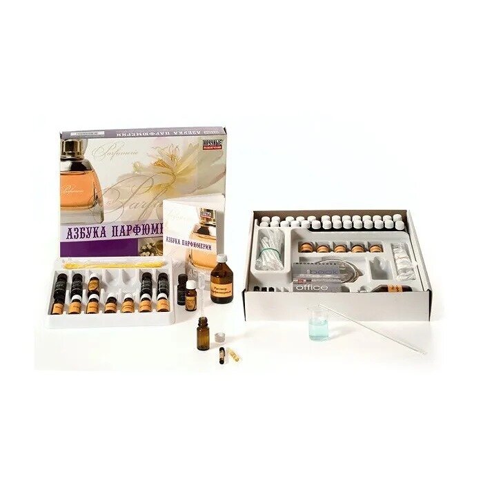 | Состав набора | 12 эфирных масел; 8 синтетических душистых веществ; парфюмерный раствор (2×100 мл); стеклянная лабораторная посуда (предметные стекла, чашка Петри, пробирки, палочки для смешивания); 26 пустых флаконов; вспомогательные аксессуары; инструкция |