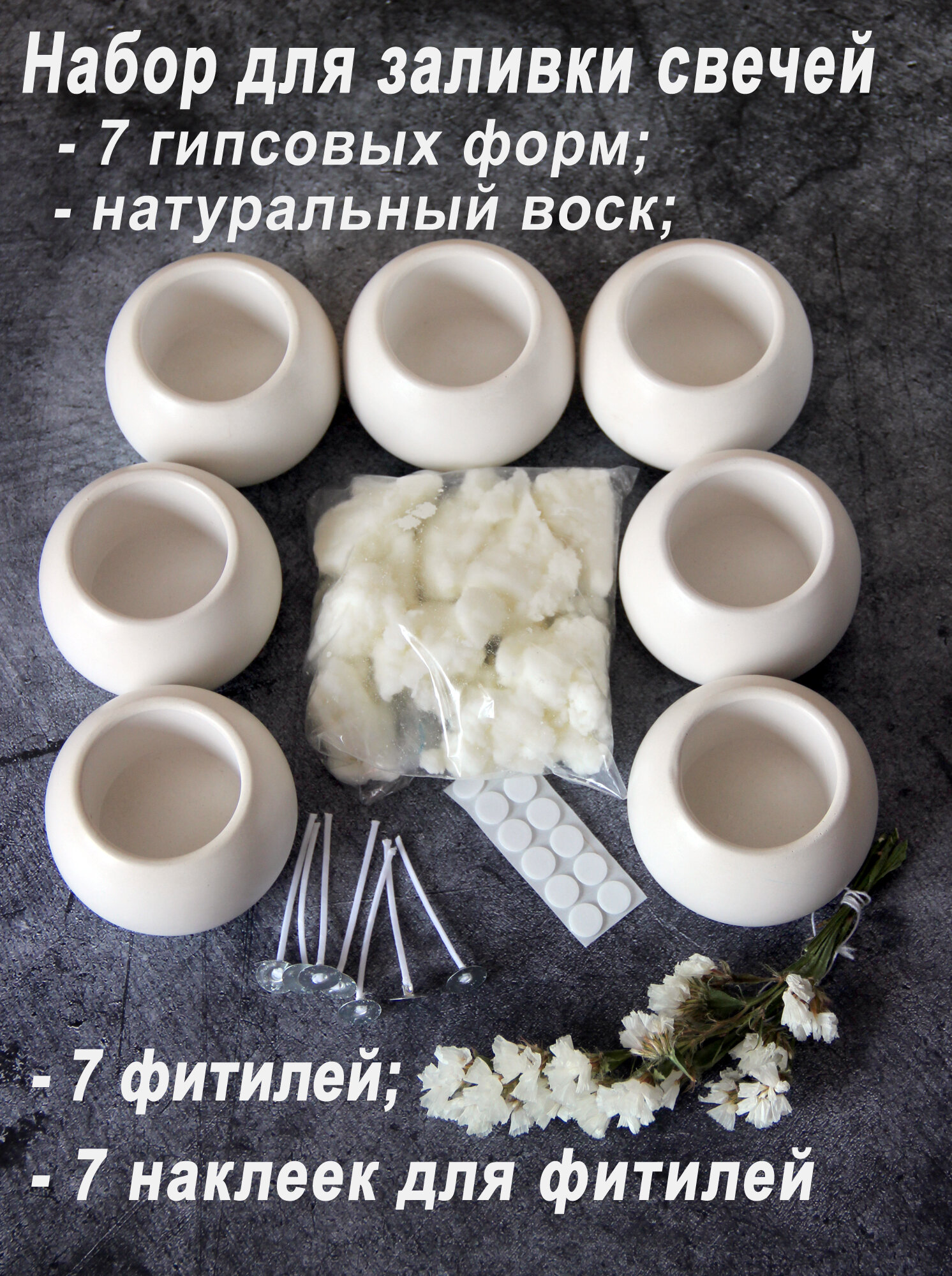 | Комплектация | Гипсовые формы, воск, фитили, наклейки для фитилей |