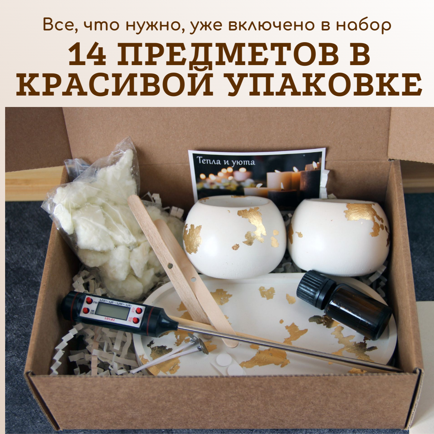 | Комплектация | Поднос, две формы для заливки свечи, два фитиля, центраторы, крепление для фитилей, аромаотдушка, воск, палочка для перемешивания, открытка, термощуп, инструкция |