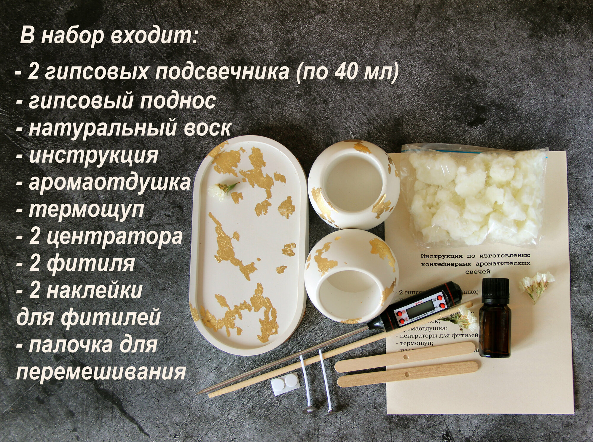 | Комплектация | Поднос, две формы для заливки свечи, два фитиля, центраторы, крепление для фитилей, аромаотдушка, воск, палочка для перемешивания, открытка, термощуп, инструкция |