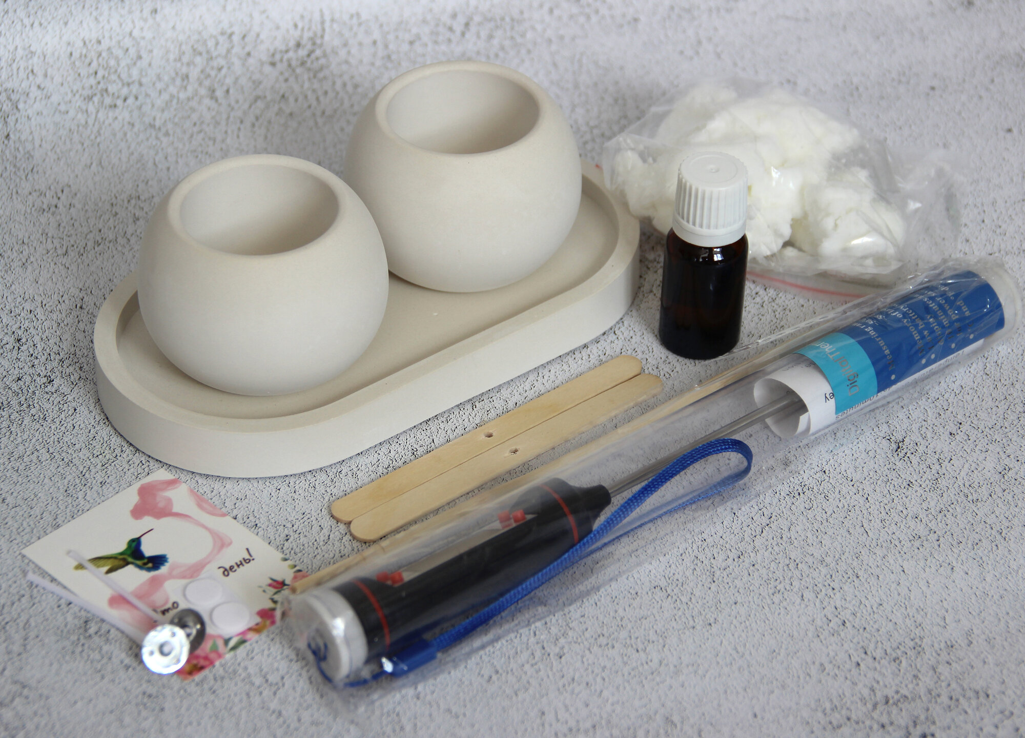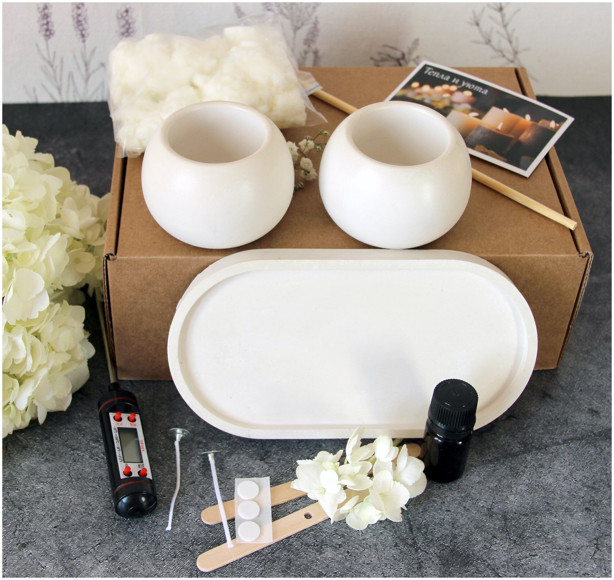 | Комплектация | Поднос, две формы для заливки свечи, два фитиля, центраторы, крепление для фитилей, аромаотдушка, воск, палочка для перемешивания, открытка, термощуп, инструкция |