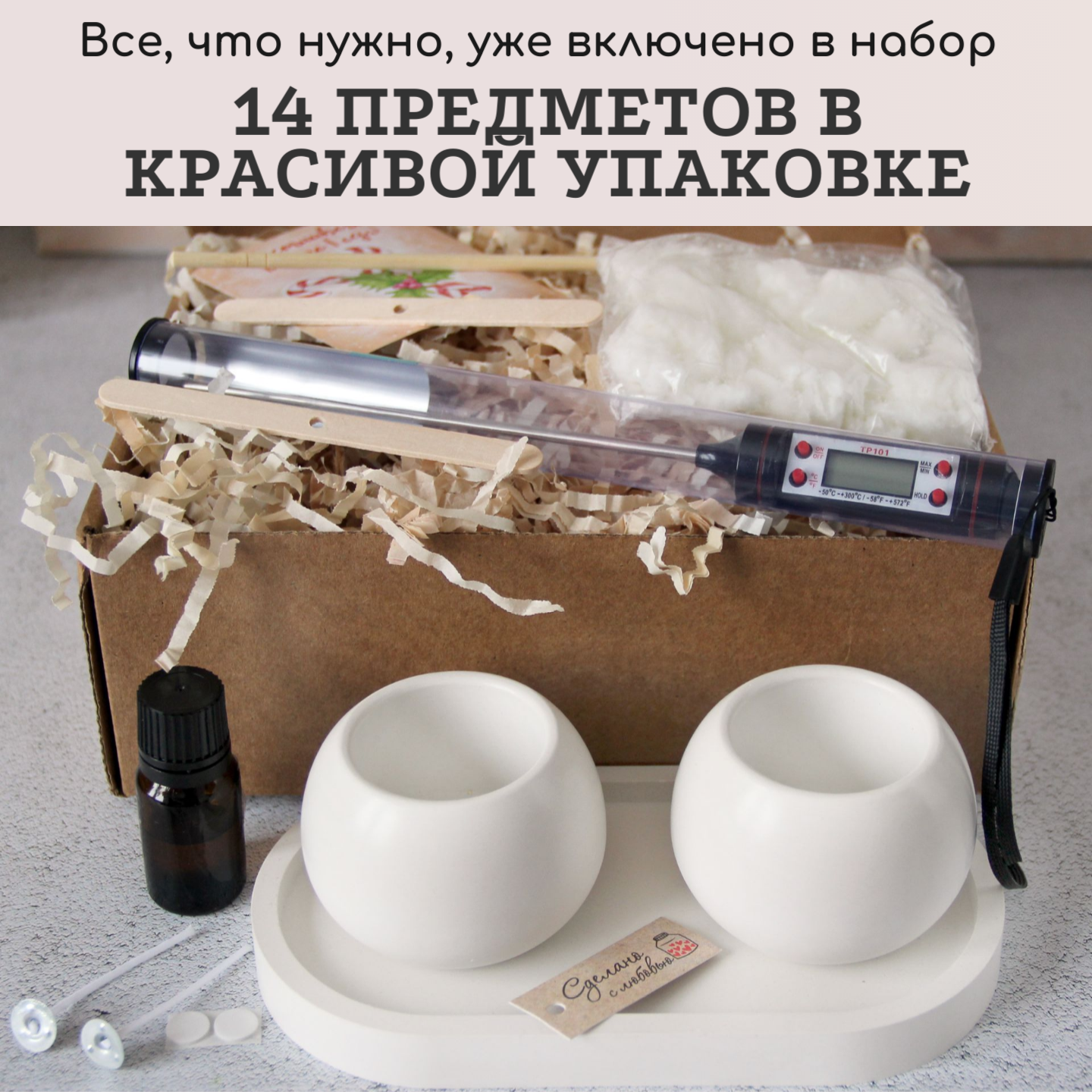 | Комплектация | Поднос, две формы для заливки свечи, два фитиля, центраторы, крепление для фитилей, аромаотдушка, воск, палочка для перемешивания, открытка, термощуп, инструкция |