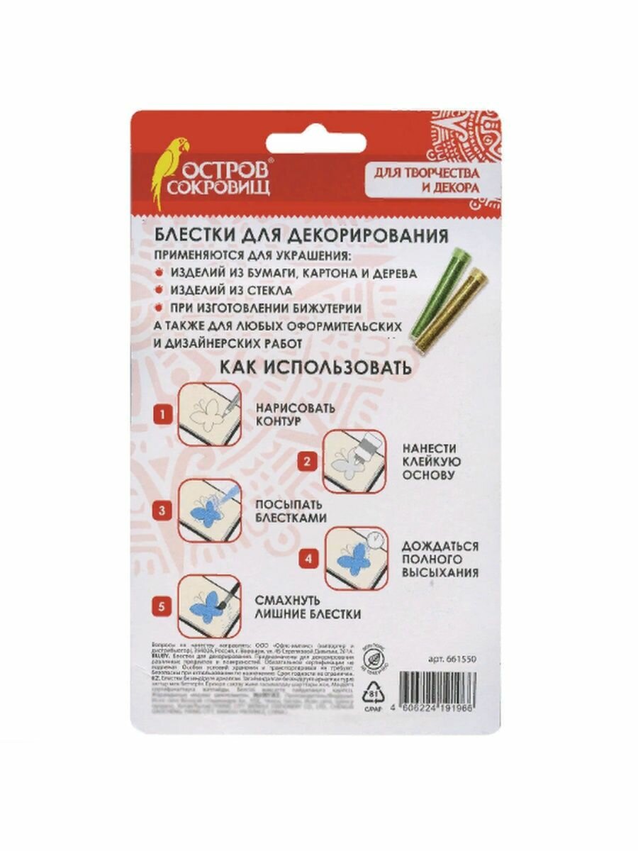 СохранитьКомплект 5 шт, Блестки (глиттер) для декора, поделок, DIY, творчества, оформления, остров сокровищ, набор, 6 цветов по 6.5 грамм, блистер, 661550 интересное: