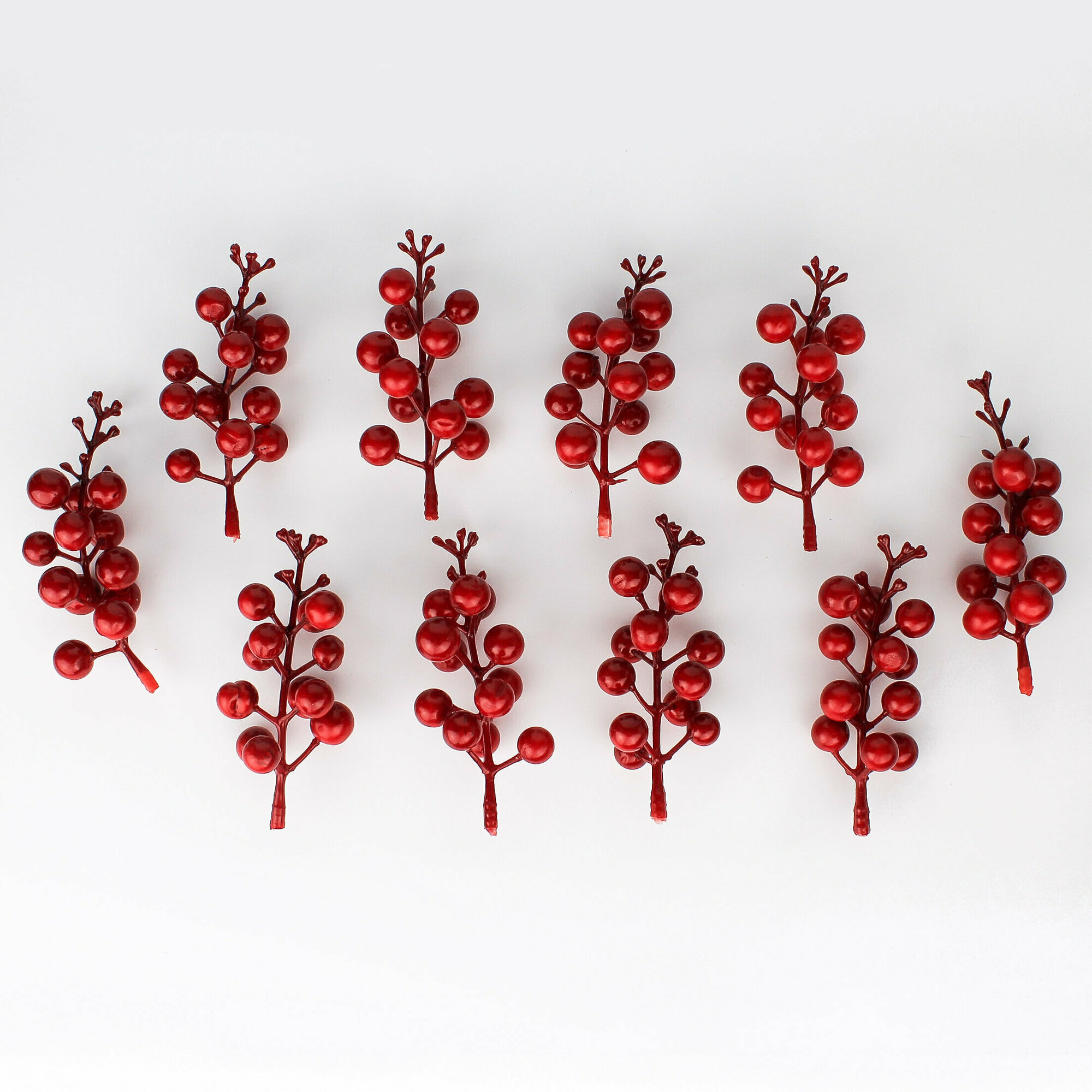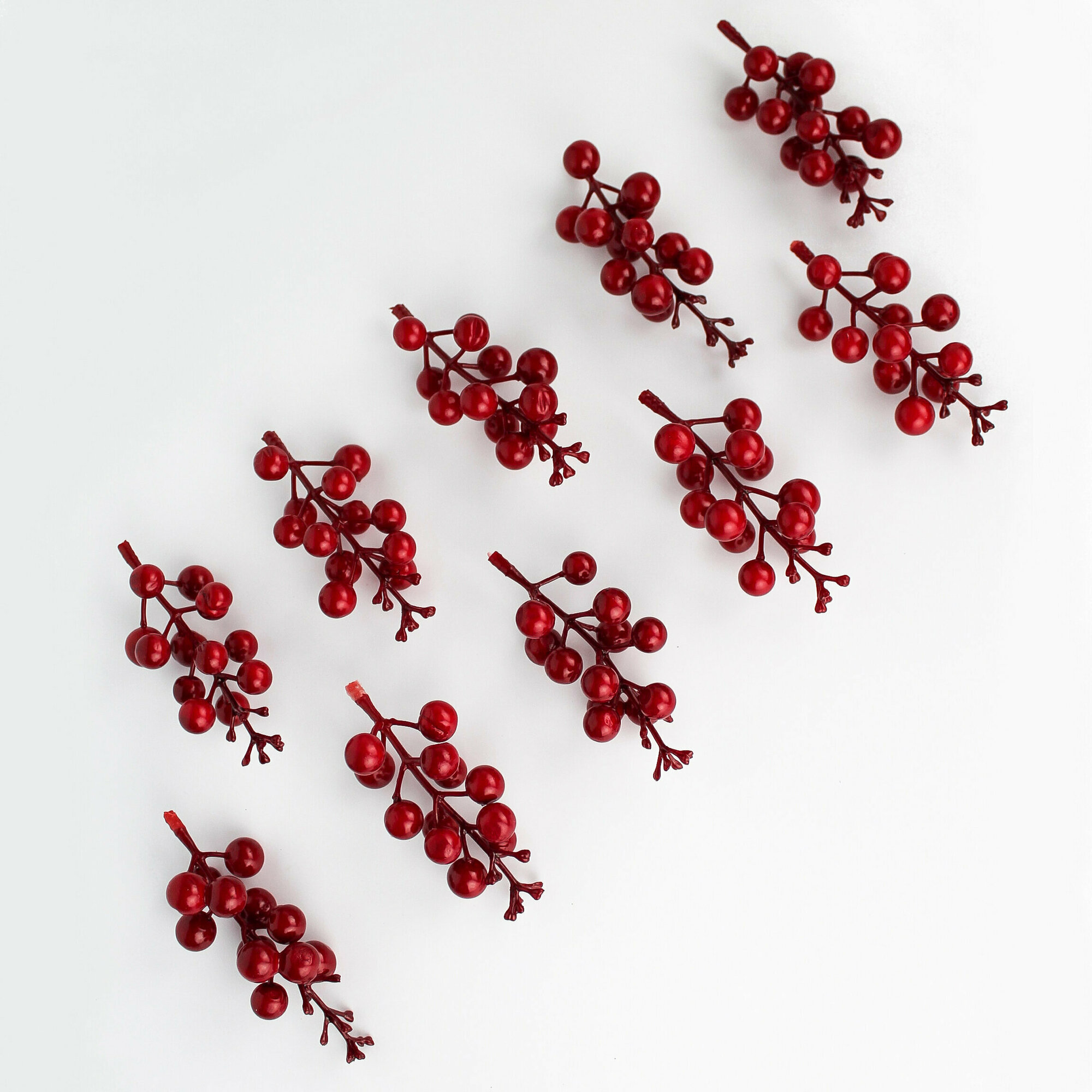 Купить Ягоды красные искусственные на ветке, гроздь 11 см, 12-15 мм, набор 10 шт.