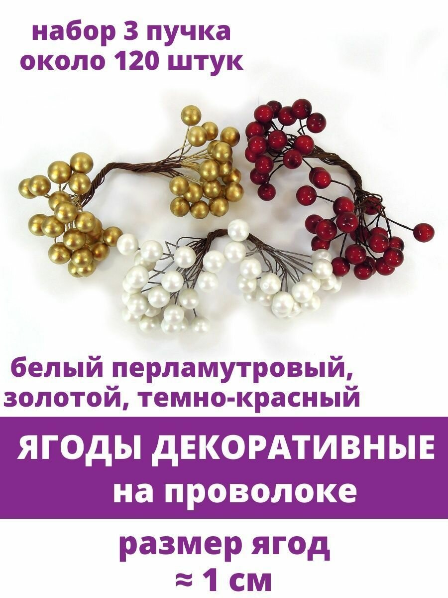 Купить Ягоды декоративные, набор 3 пучка (примерно 120 ягодок), белый перламутровый, золотой, темно-красные