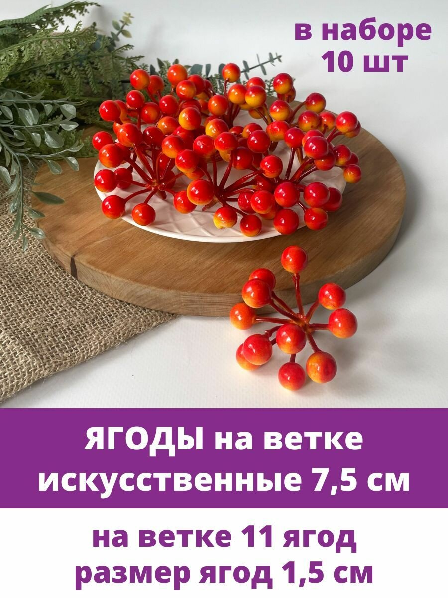 Ягоды красные искусственные на ветке, гроздь 11 см, 12-15 мм, набор 10 шт.