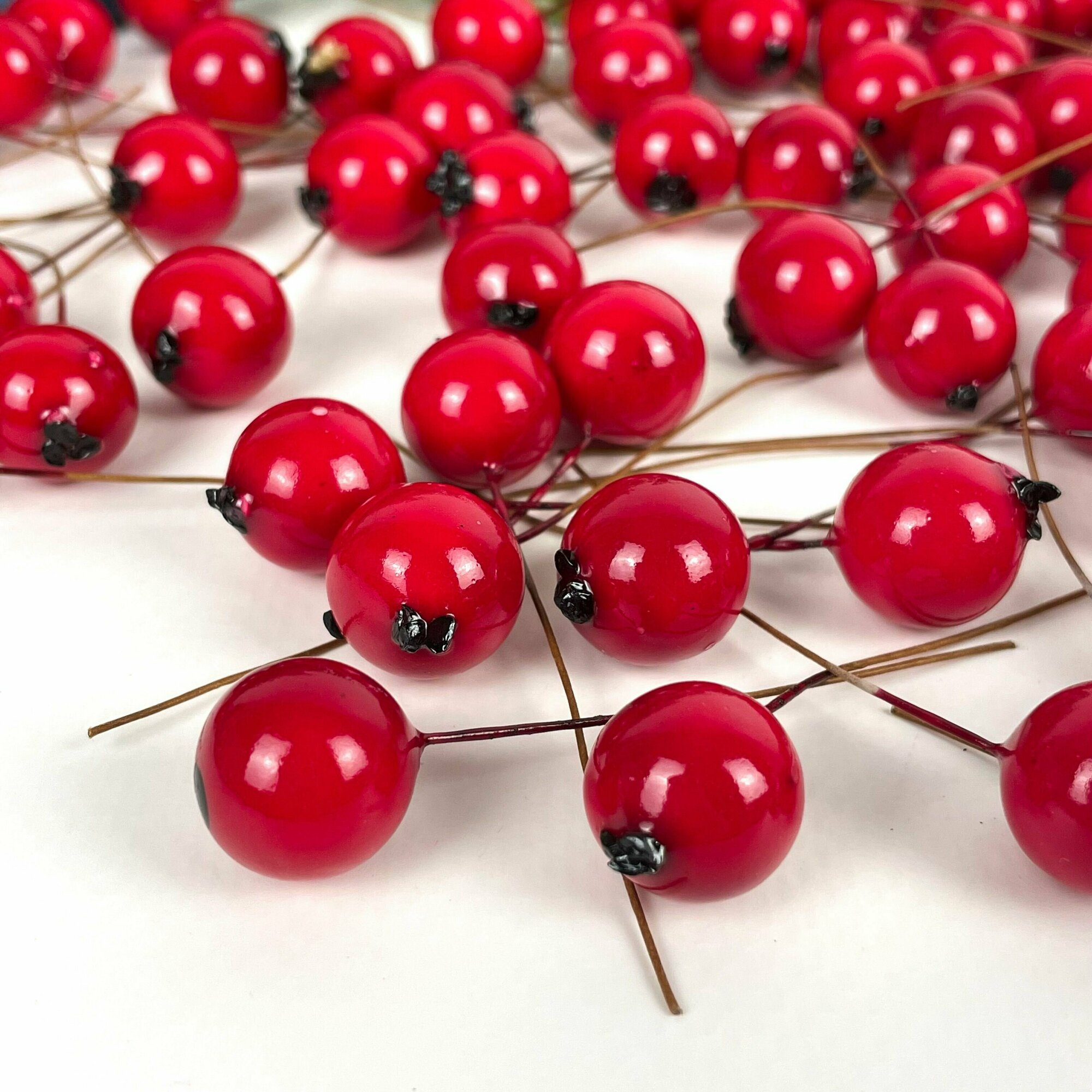 Ягоды красные искусственные, на ветке 5 ягод 10-13 мм, набор 20 шт.