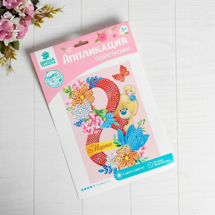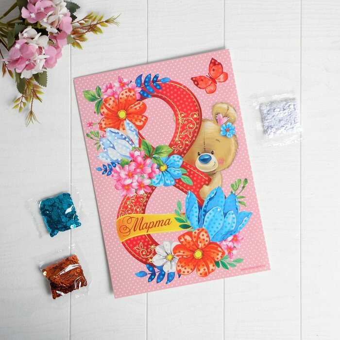 Купить Аппликация пайетками «С 8 марта» Мишка + 4 цвета пайеток по 7 г