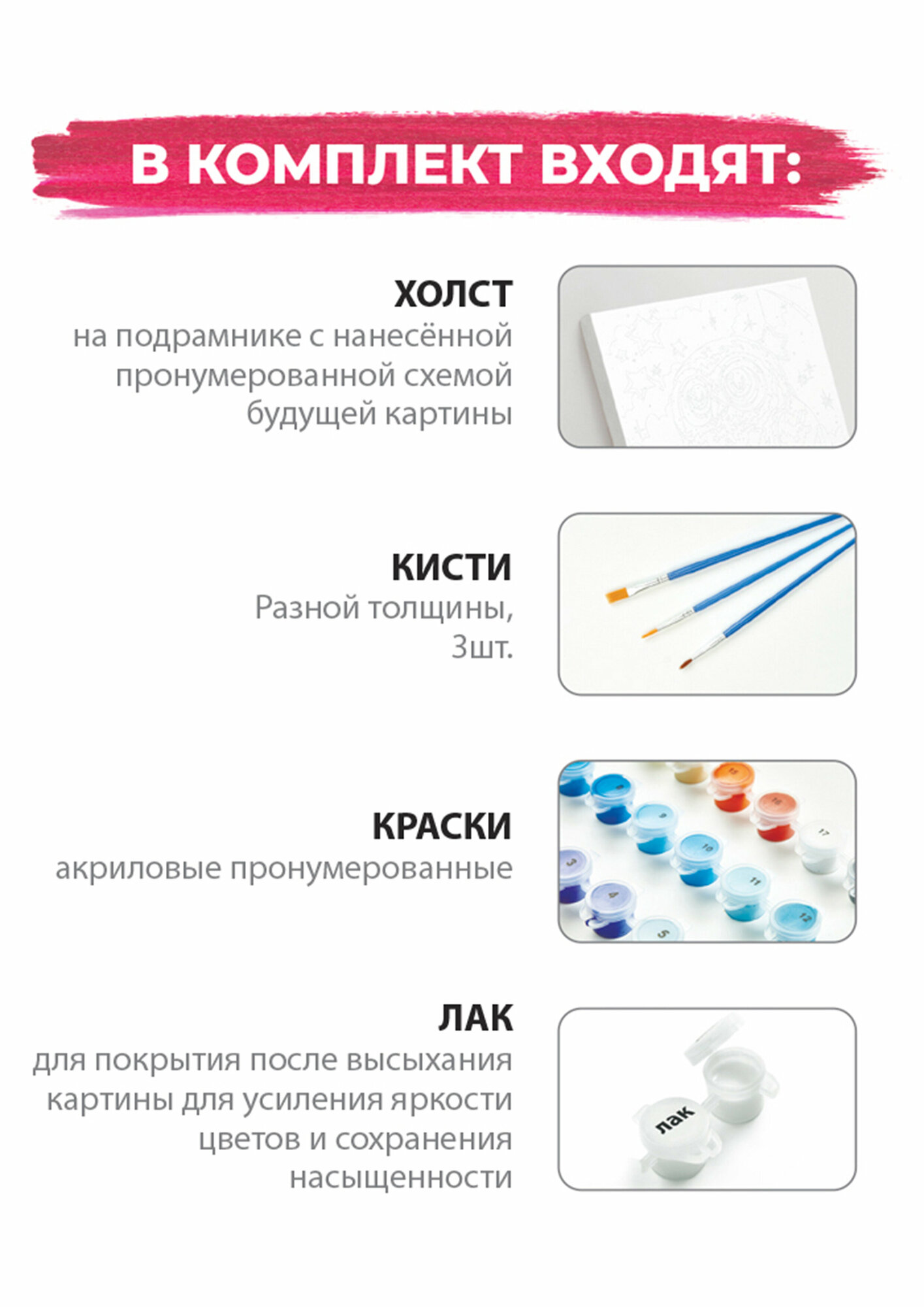 | Комплектация | холст на деревянном подрамнике размера 40х50 см, с нанесенным контурным рисунком, набор акриловых красок, глянцевый лак, 3 кисти разного размера, настенное крепление, схема картины в электронном виде по QR-коду |