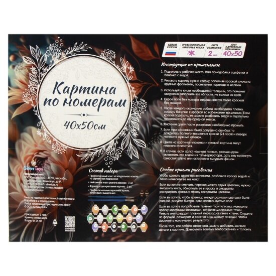 | Комплектация | холст из натурального хлопка на деревянном подрамнике; холст предварительно прогрунтован, 2 нейлоновые кисти разного размера, профессиональные акриловые краски; устойчивые к выцветанию, крепления для картины; две баночки с люминесцентной краской. |