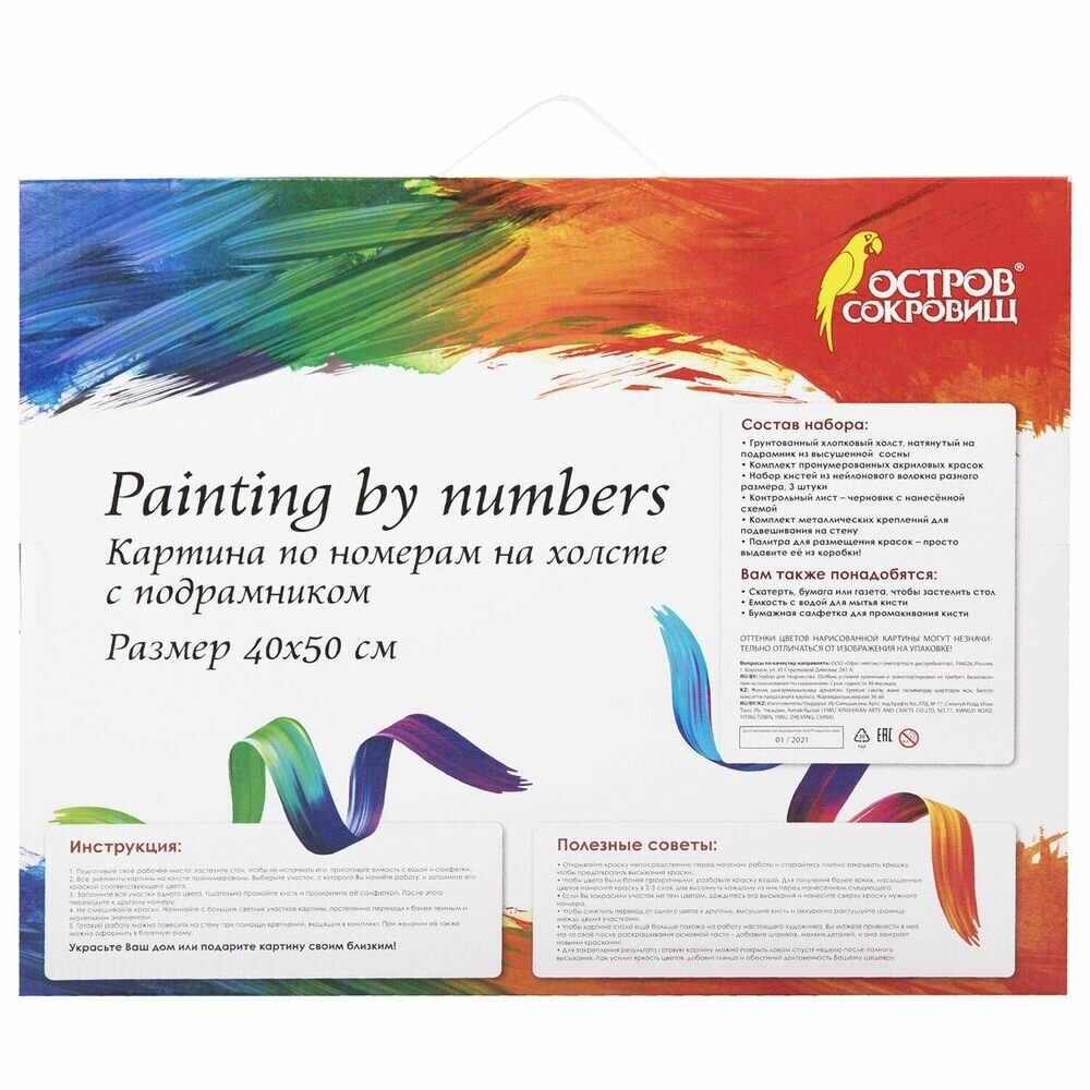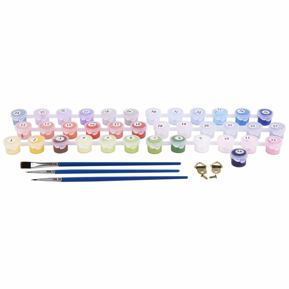 | Комплектация | 1 хлопковый холст на подрамнике с контуром, 1 лист бумаги для тренировки, 26 акриловых красок объемом 3 мл каждая, 3 синтетические кисти и комплект металлических креплений для подвешивания на стену |