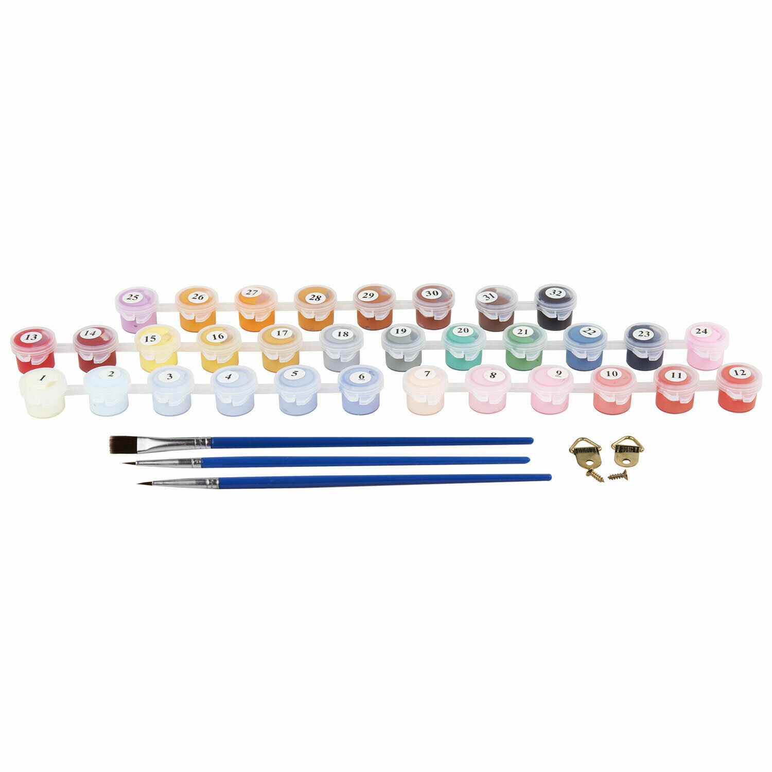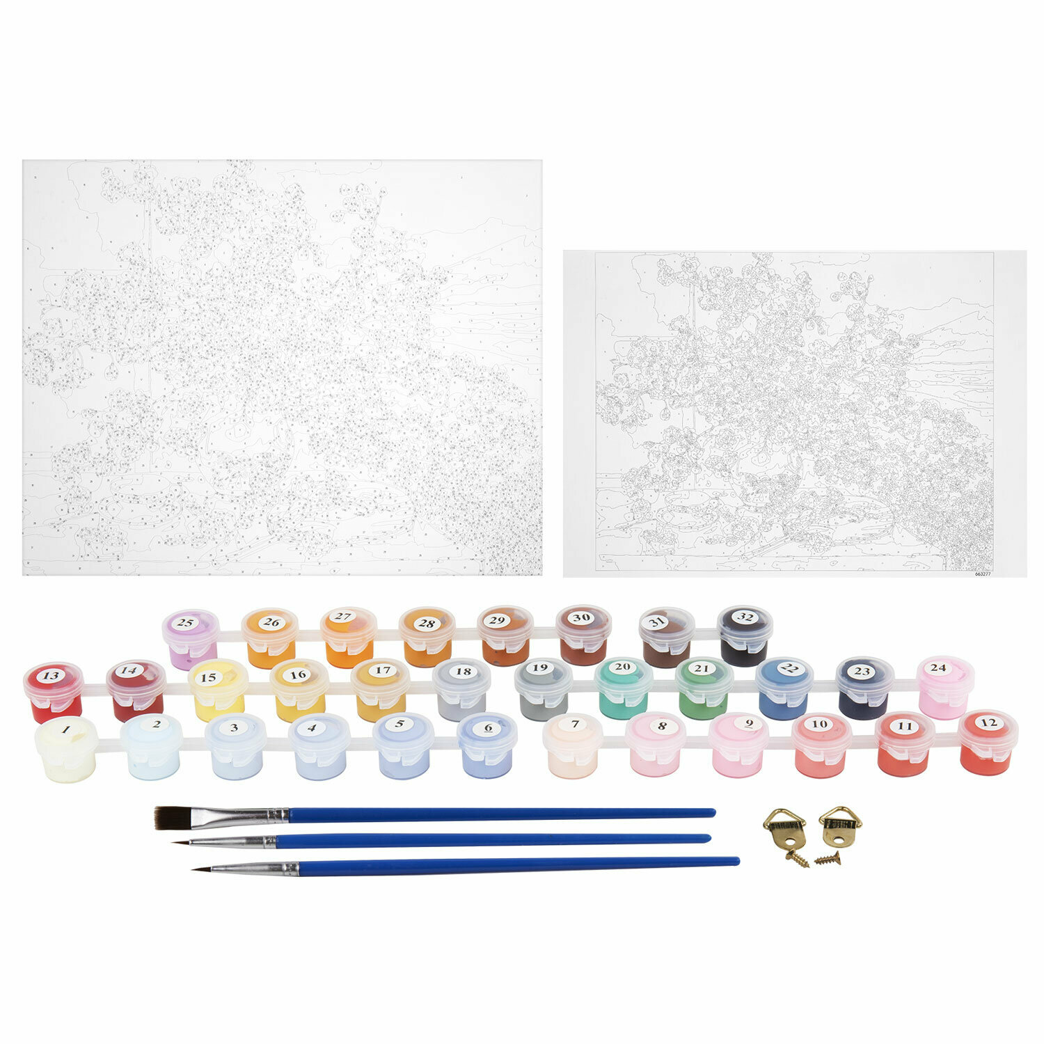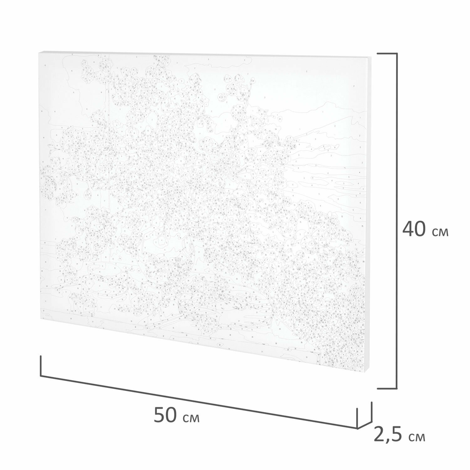 | Комплектация | 1 хлопковый холст на подрамнике с контуром, 1 лист бумаги для тренировки, 26 акриловых красок объемом 3 мл каждая, 3 синтетические кисти и комплект металлических креплений для подвешивания на стену |