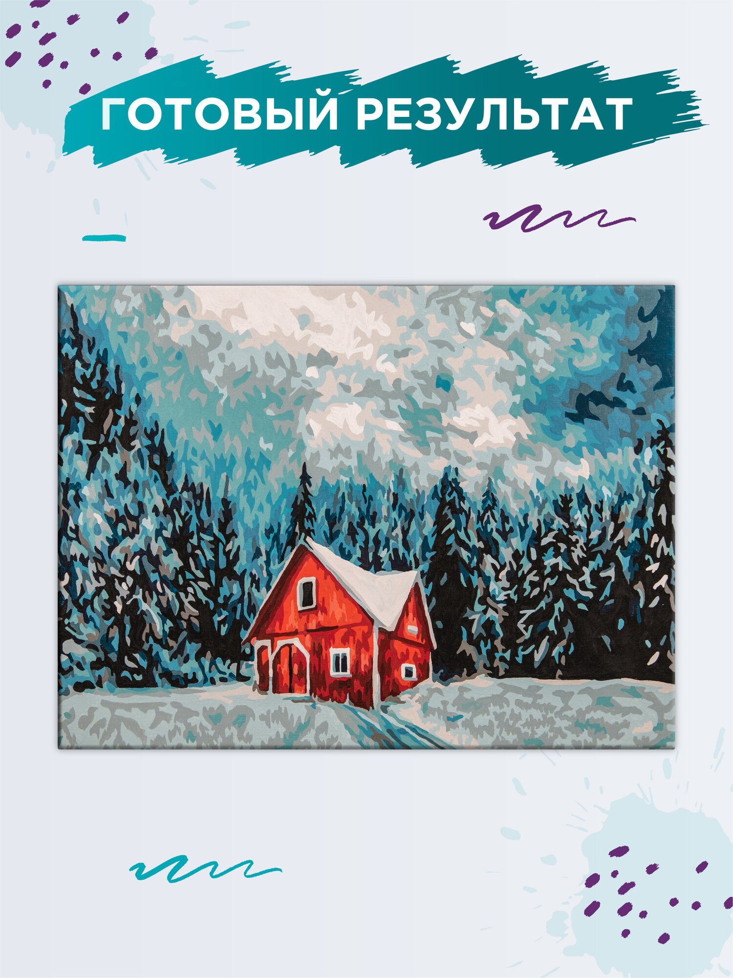 | Комплектация | холст на подрамнике, акриловые краски в пронумерованных баночках, три кисти разного размера, инструкция с контрольным листом и эталоном готовой картины |