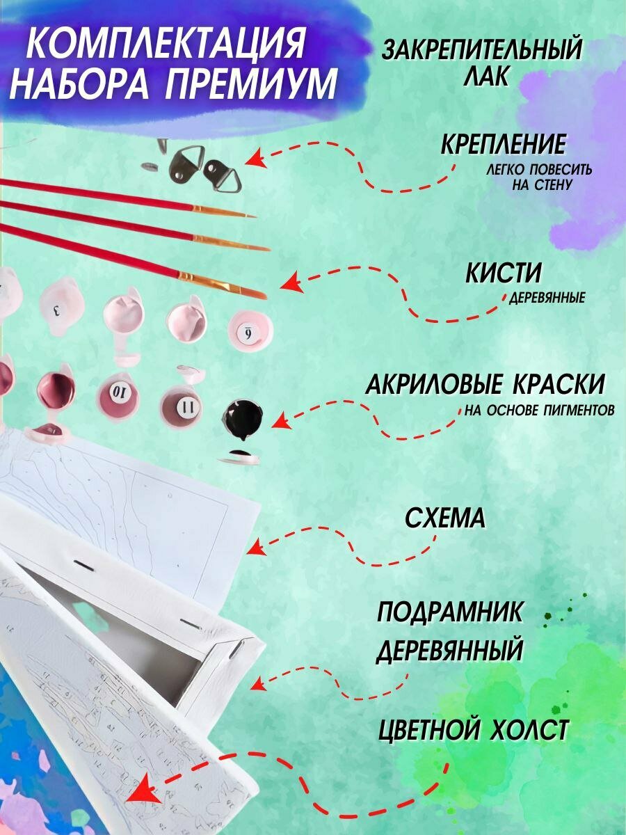 | Комплектация | холст на деревянном подрамнике,кисточки - 3 шт.,акриловые краски,кисточки,лак для финишного покрытия,контрольный лист: черно-белый и цветной,крепление для подвешивания картины на стену,инструкция. |